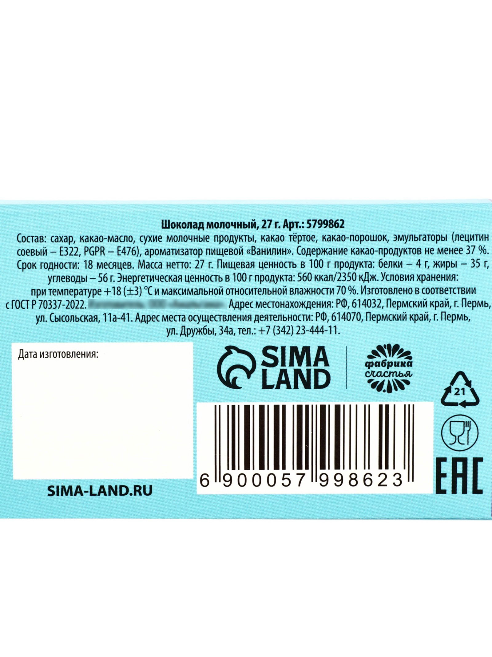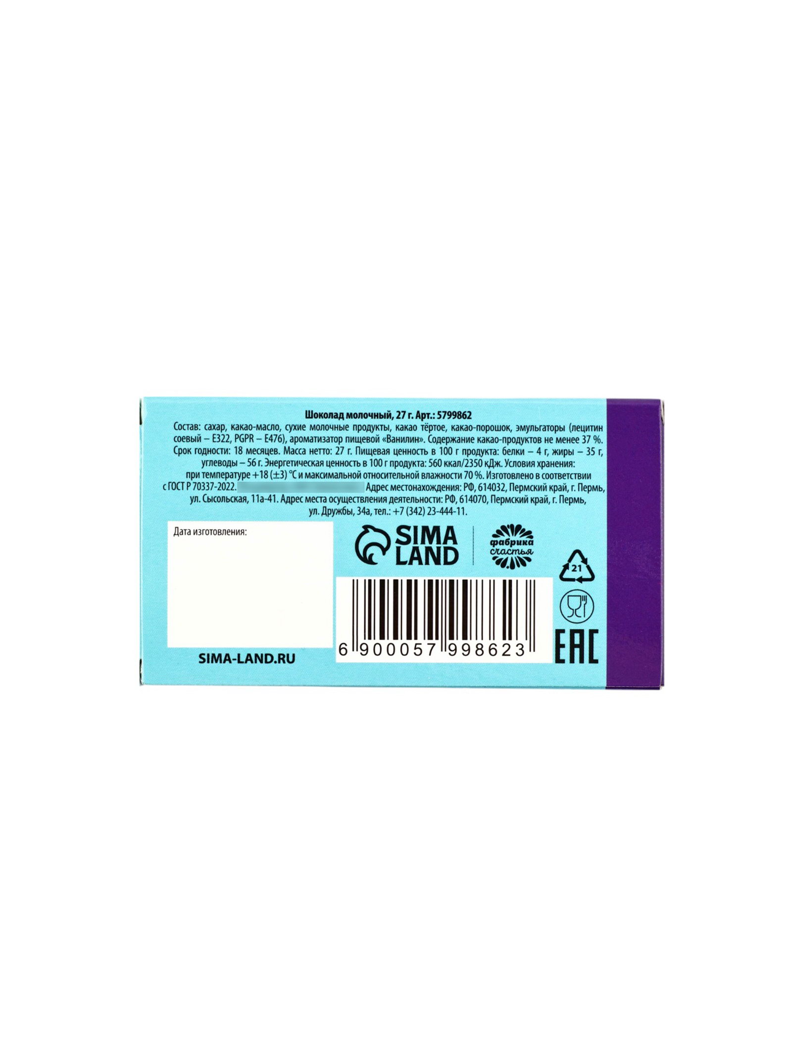 Запрет реализации по сегментам: 00000000266, 00000000593 Размер упаковки: 5.2 x 1 x 9.3 см. Срок годности, мес: 12 Тематика праздника: Универсальная тематика tnved: 1806901900 Температурное ограничение: Нет Форма: Мини-плитка Вид шоколада: Молочный Добавки: Без добавок Вес нетто, г: 27 Белки, г: 4 Энергетическая ценность, ккал: 560 Углеводы, г: 56 Жиры, г: 35 При оформление заказа, просим запрашивать актуальные сроки годности у менеджераСостав: сухое цельное молоко, какое тёртое, масло какао, сухая молочная сыворотка, обезвоженный молочный жир, сахар, эмульгатор: соевый лецитин, ароматизатор, идентичный натуральному "Ванилин". Масса нетто: 27 гр Срок годности: 12 месяцев. | ||