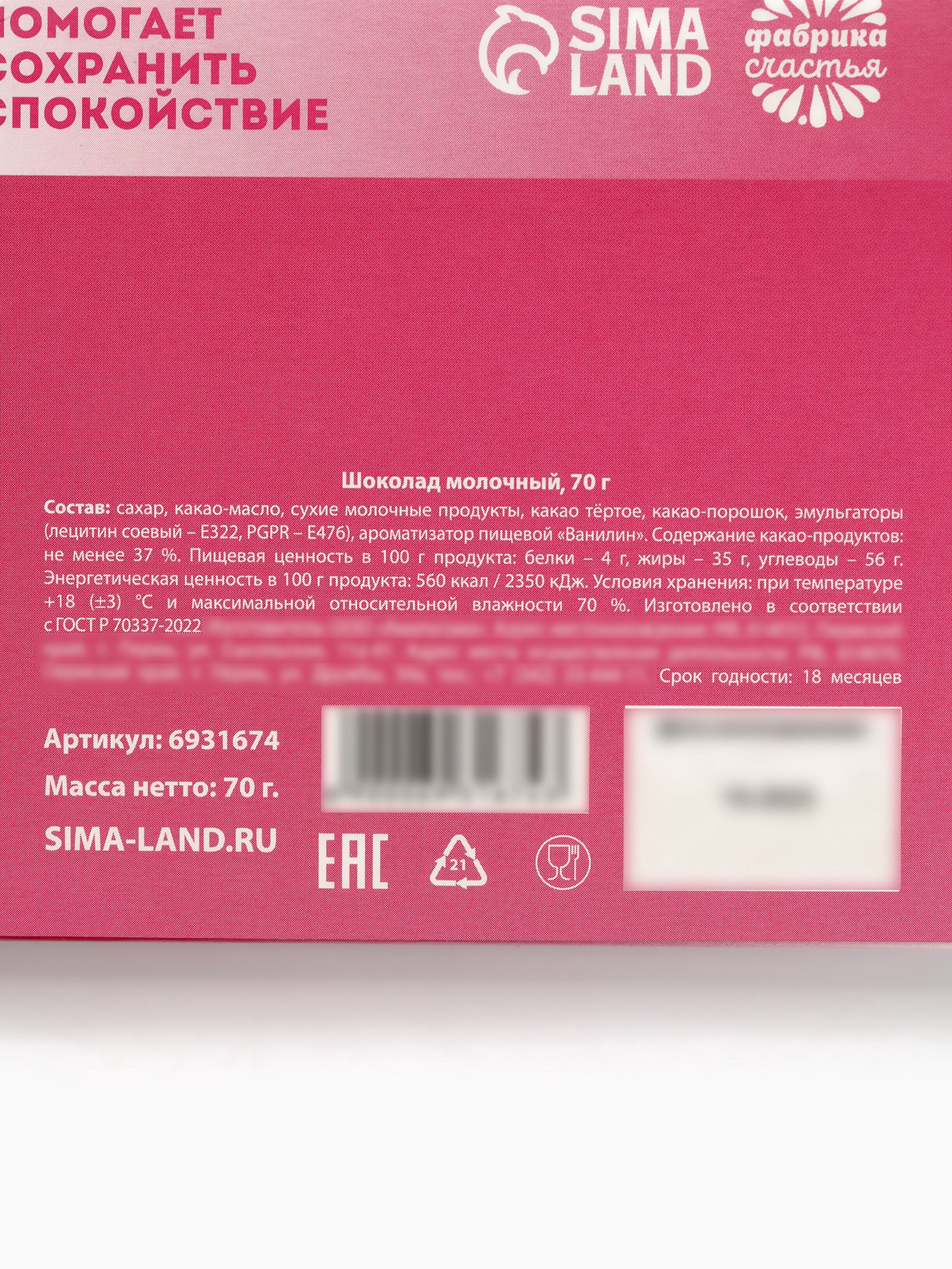 Тематика праздника: 8 Марта, Универсальная тематика Запрет реализации по сегментам: 00000000266, 00000000593 Размер упаковки: 1.5 x 18 x 10 см. Темпер. ограничение НЕ ВЫШЕ ℃: +18 Темпер. ограничение НЕ НИЖЕ ℃: +5 tnved: 1806201000 Температурное ограничение: Нет Форма: Плитка Добавки: Без добавок Вид шоколада: Молочный Вес нетто, г: 70 Белки, г: 8 Углеводы, г: 53 Энергетическая ценность, ккал: 560 Жиры, г: 35 Состав: сахар, какао-масло, сухие молочные продукты, какао тертое, какао-порошок, эмульгаторы (лецитин соевый – Е322, PGPR – Е476), ароматизатор пищевой "Ванилин". Содержание какао продуктов не менее 37 %. Срок годности: 12 месяцев. Масса нетто: 70 г | ||