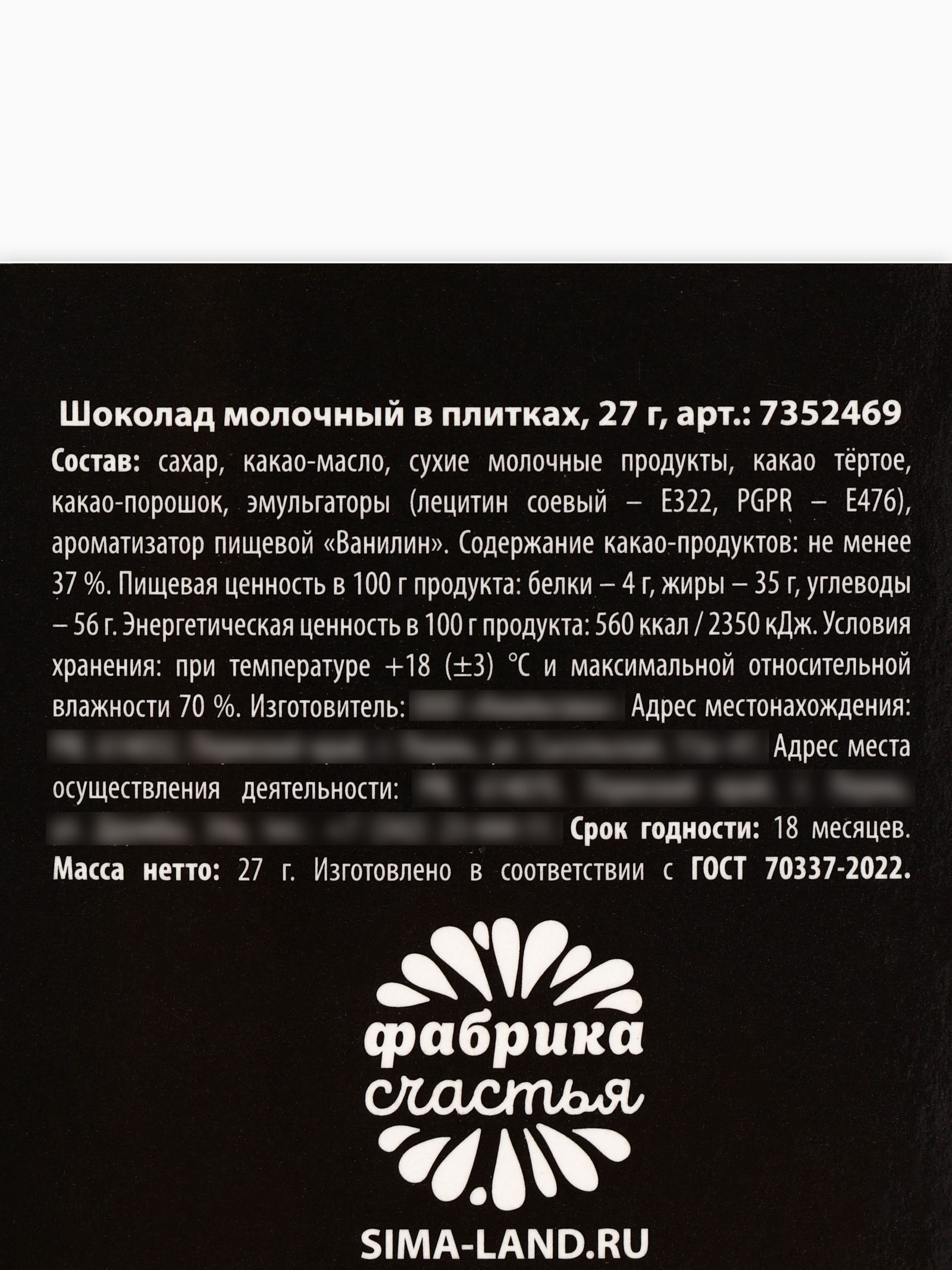 Запрет реализации по сегментам: 00000000266, 00000000593 Размер упаковки: 5.2 x 1 x 9.3 см. Темпер. ограничение НЕ ВЫШЕ ℃: +18 Темпер. ограничение НЕ НИЖЕ ℃: +5 Срок годности, мес: 12 Тематика праздника: Универсальная тематика tnved: 1806201000 Температурное ограничение: Нет Форма: Плитка Вид шоколада: Молочный Добавки: Без добавок Вес нетто, г: 27 Жиры, г: 35 Углеводы, г: 56 Белки, г: 4 Энергетическая ценность, ккал: 560 ПРИ ОФОРМЛЕНИИ ЗАКАЗА, ПРОСИМ ЗАПРАШИВАТЬ АКТУАЛЬНЫЕ СРОКИ ГОДНОСТИ У МЕНЕДЖЕРА Состав: сухое цельное молоко, какао тёртое, масло какао, сухая молочная сыворотка, обезвоженный молочный жир, сахар, эмульгатор – соевый лецитин, ароматизатор, идентичный натуральному, "Ванилин". Масса нетто: 27 г Срок годности: 12 месяцев с даты производства. | ||