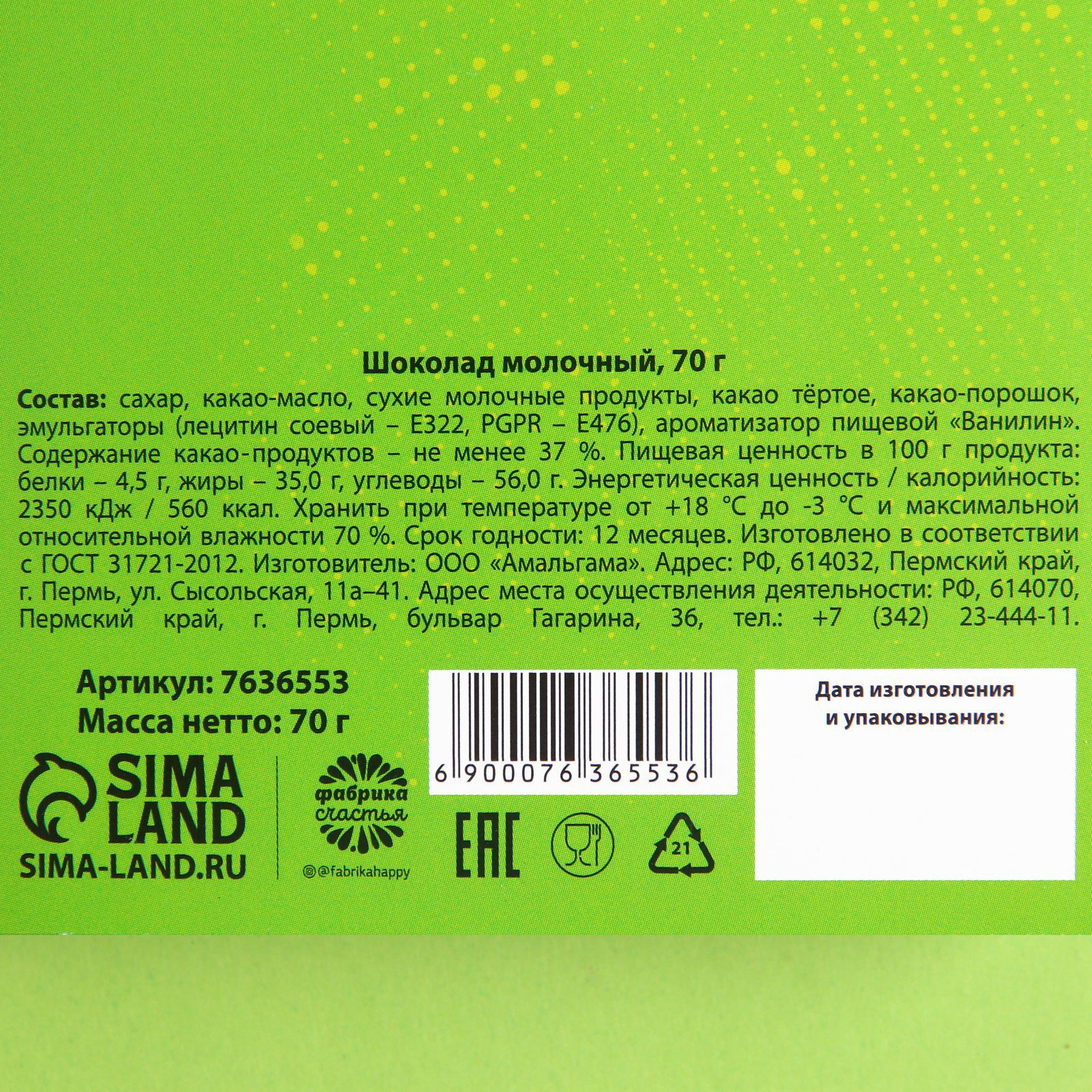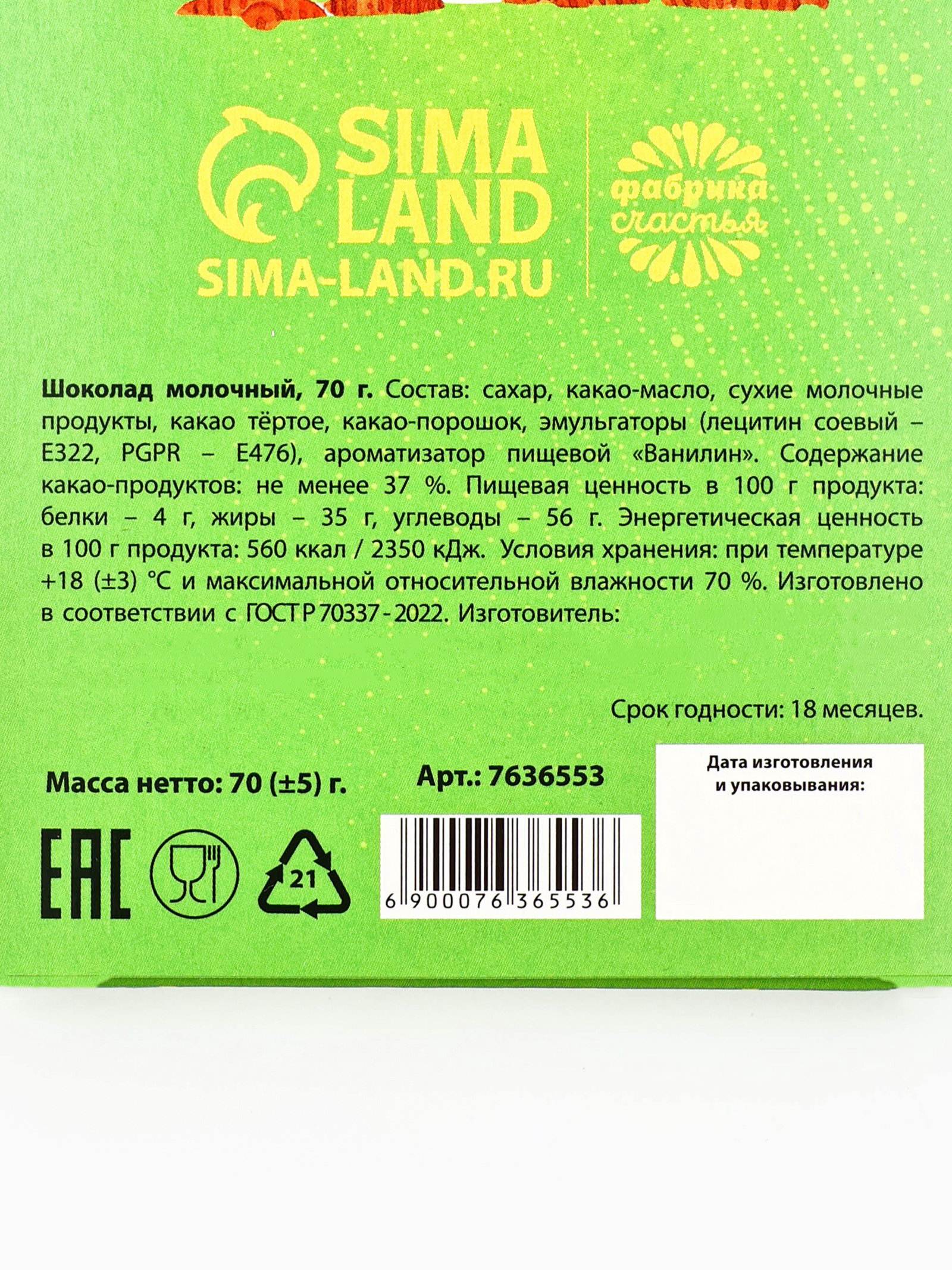 Запрет реализации по сегментам: 00000000266, 00000000593 Размер упаковки: 1.2 x 17.5 x 9.5 см. Тематика праздника: Пасха Тематика праздника: Пасха tnved: 1806201000 Форма: Плитка Вес нетто, г: 70 Добавки: Без добавок Вид шоколада: Молочный Жиры, г: 35 Энергетическая ценность, ккал: 560 Белки, г: 4.5 Углеводы, г: 56 При оформление заказа, просим запрашивать актуальные сроки годности у менеджераСостав: сахар, какао-масло, сухие молочные продукты, какао тертое, какао-порошок, эмульгаторы (лецитин соевый – Е322, PGPR – Е476), ароматизатор пищевой "Ванилин". Содержание какао продуктов – не менее 37 %. Срок годности: 12 месяцев. Масса нетто: 70 г | ||