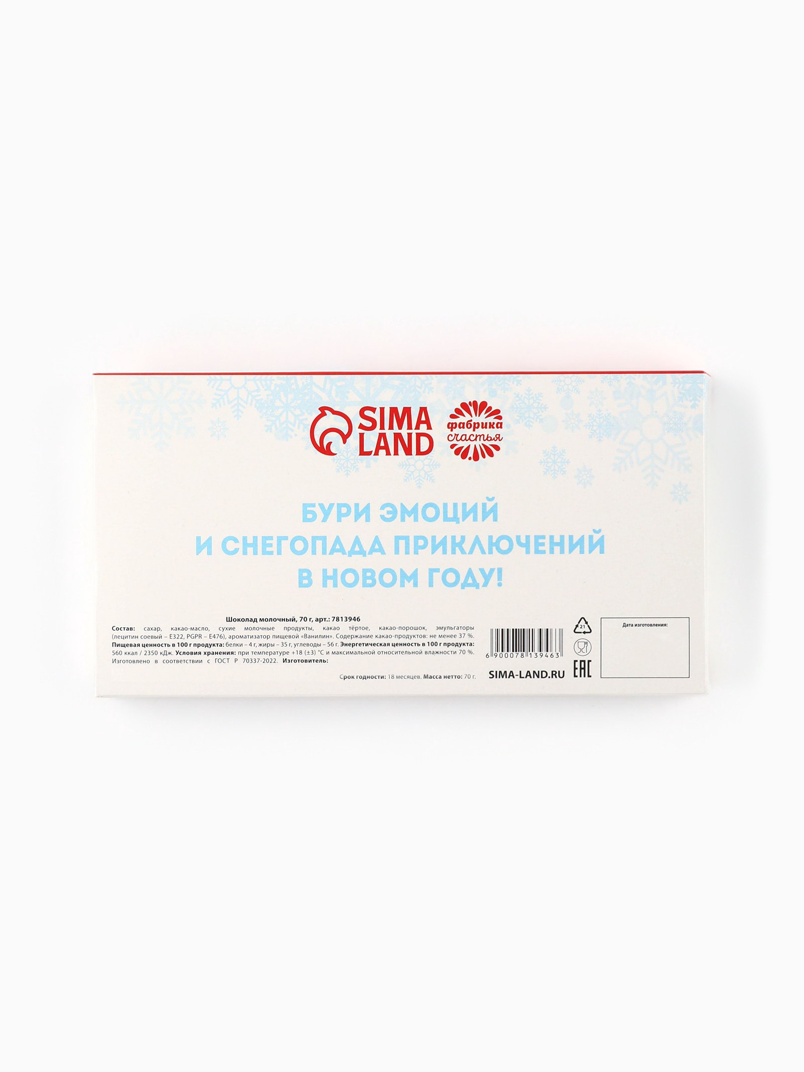 Запрет реализации по сегментам: 00000000266, 00000000534, 00000000593 Размер упаковки: 9.5 x 17.5 x 1.5 см. Тематика праздника: Новый год tnved: 1806201000 Набор: Нет Новогодняя коллекция: Новый год Символ года: Символ года 2026 (Лошадь) Температурное ограничение: Нет Форма: Плитка Вид шоколада: Молочный Добавки: Без добавок Углеводы, г: 56 Белки, г: 4 Энергетическая ценность, ккал: 560 Вес нетто, г: 70 Жиры, г: 35 При оформление заказа, просим запрашивать актуальные сроки годности у менеджераПРИ ОФОРМЛЕНИИ ЗАКАЗА, ПРОСИМ ЗАПРАШИВАТЬ АКТУАЛЬНЫЕ СРОКИ ГОДНОСТИ У МЕНЕДЖЕРА. Состав: сахар, какао-масло, сухие молочные продукты, какао тертое, какао-порошок, эмульгаторы (лецитин соевый – Е322, PGPR – Е476), ароматизатор пищевой "Ванилин". Срок годности: 12 месяцев Масса нетто: 70 гр | ||