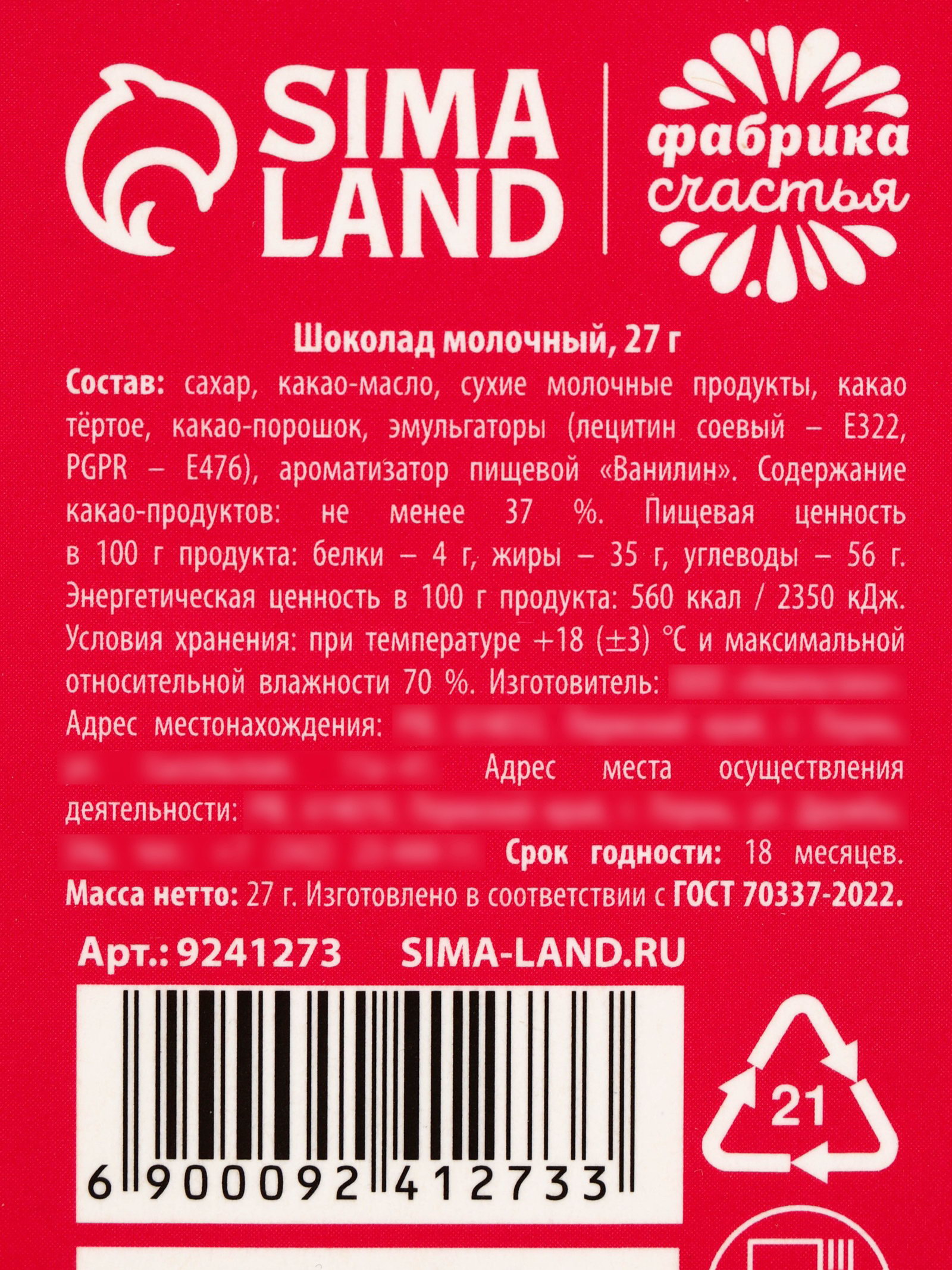 Запрет реализации по сегментам: 00000000266, 00000000593 Размер упаковки: 5 x 1 x 9 см. Темпер. ограничение НЕ ВЫШЕ ℃: +18 Тематика подарка: Продукты питания tnved: 1806201000 Набор: Нет Адресат: Без адресата Для кого: Для женщины Температурное ограничение: Нет Тематика праздника: 8 Марта Углеводы, г: 56 Вес нетто, г: 27 Белки, г: 4 Энергетическая ценность, ккал: 560 Жиры, г: 35 Вид шоколада: Молочный Форма: Плитка Добавки: Без добавок Состав: сахар, какао-масло, сухие молочные продукты, какао тёртое, какао-порошок, эмульгаторы (лецитин соевый Е322, PGPR – E476), ароматизатор, идентичный натуральному, "Ванилин". Масса нетто: 27 г Срок годности: 12 мес. | ||