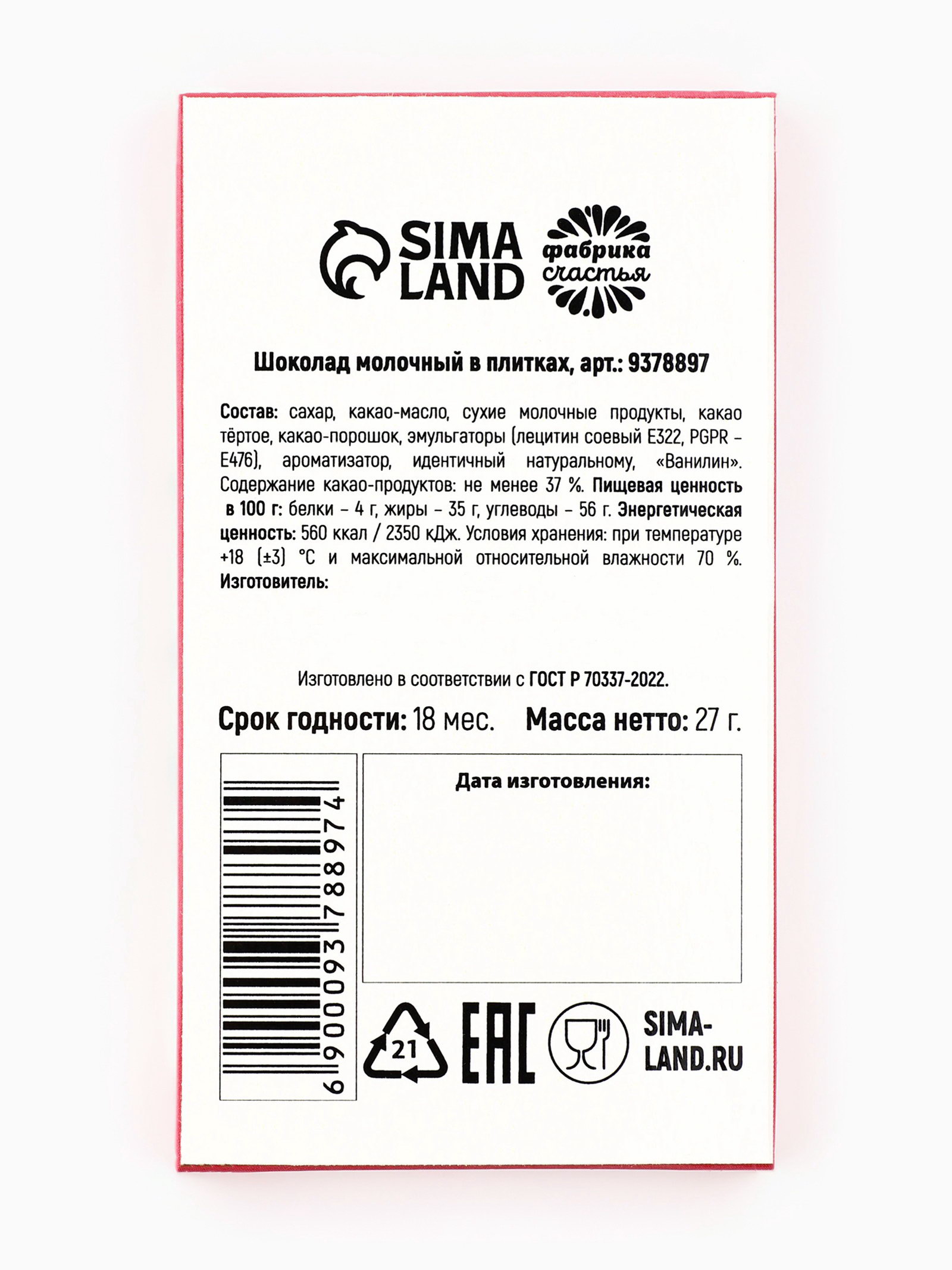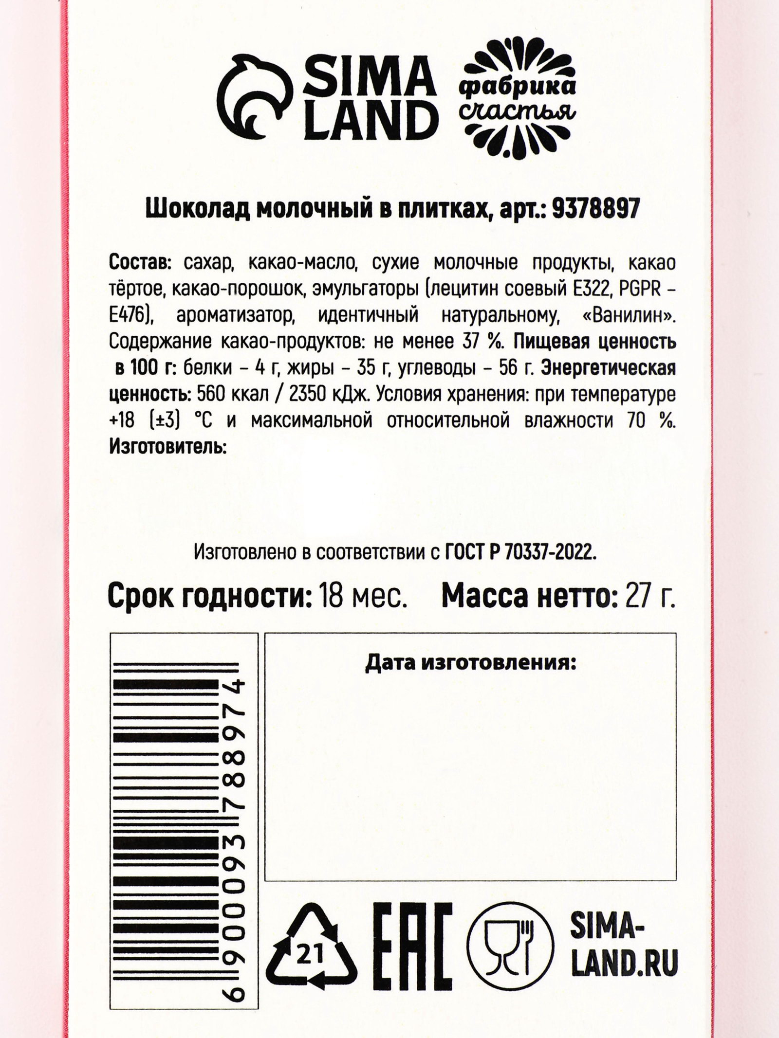 Запрет реализации по сегментам: 00000000266, 00000000593 Размер упаковки: 1 x 9.2 x 5.2 см. Размер упаковки: 1 x 9.2 x 5.2 см. tnved: 1806901900 Температурное ограничение: Нет Добавки: Без добавок Форма: Плитка Вид шоколада: Молочный Вес нетто, г: 27 Жиры, г: 35 Белки, г: 4 Энергетическая ценность, ккал: 560 Углеводы, г: 56 Тематика праздника: Пасха Состав: сахар, какао-масло, сухие молочные продукты, какао тёртое, какао-порошок, эмульгаторы (лецитин соевый Е322, PGPR – E476), ароматизатор, идентичный натуральному, "Ванилин". Содержание какао-продуктов: не менее 37 %. Срок годности: 12 мес. Масса нетто: 27 г | ||