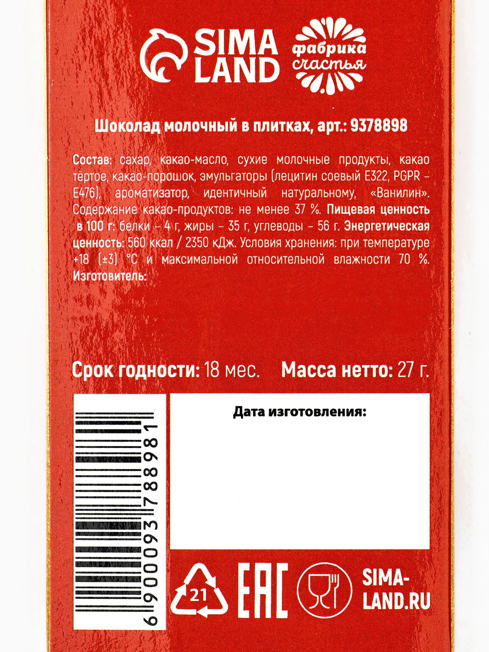 Запрет реализации по сегментам: 00000000266, 00000000593 Размер упаковки: 1 x 9.2 x 5.2 см. tnved: 1806901900 tnved: 1806901900 Температурное ограничение: Нет Вид шоколада: Молочный Добавки: Без добавок Форма: Плитка Жиры, г: 35 Энергетическая ценность, ккал: 560 Вес нетто, г: 27 Белки, г: 4 Углеводы, г: 56 Тематика праздника: Пасха Состав: сахар, какао-масло, сухие молочные продукты, какао тёртое, какао-порошок, эмульгаторы (лецитин соевый Е322, PGPR – E476), ароматизатор, идентичный натуральному, "Ванилин". Содержание какао-продуктов: не менее 37 %. Срок годности: 12 мес. Масса нетто: 27 г | ||