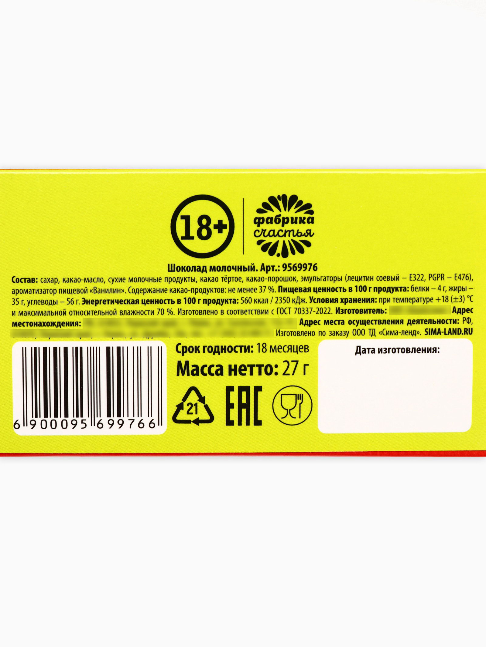 Запрет реализации по сегментам: 00000000266, 00000000593 Размер упаковки: 5.2 x 1 x 9.3 см. Темпер. ограничение НЕ ВЫШЕ ℃: +18 Темпер. ограничение НЕ НИЖЕ ℃: +5 Срок годности, мес: 12 Возраст: Взрослый Тематика праздника: Универсальная тематика tnved: 1806310000 Температурное ограничение: Нет Добавки: Без добавок Вид шоколада: Молочный Белки, г: 4 Углеводы, г: 56 Энергетическая ценность, ккал: 560 Жиры, г: 35 Вес нетто, г: 27 Форма: Плитка ПРИ ОФОРМЛЕНИИ ЗАКАЗА, ПРОСИМ ЗАПРАШИВАТЬ АКТУАЛЬНЫЕ СРОКИ ГОДНОСТИ У МЕНЕДЖЕРА Состав: сахар, какао-масло, сухие молочные продукты, какао-порошок, эмульгаторы (лецитин соевый Е322, PGPR- E476), ароматизатор, пищевой "Ванилин". Срок годности: 12 месяцев Масса нетто: 27 гр | ||