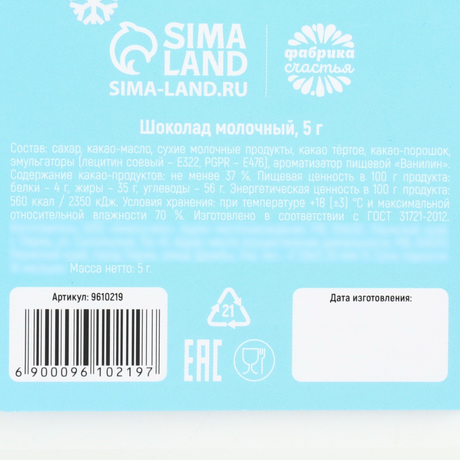 Запрет реализации по сегментам: 00000000266, 00000000593 Размер упаковки: 8 x 9 x 0.5 см. Тематика праздника: Новый год Тематика праздника: Новый год tnved: 1806310000 Символ года: Нет Новогодняя коллекция: Новый год Вес нетто, г: 5 Форма: Мини-плитка Вид шоколада: Молочный Добавки: Без добавок Энергетическая ценность, ккал: 560 Жиры, г: 35 Белки, г: 5.5 Углеводы, г: 53 ПРИ ОФОРМЛЕНИИ ЗАКАЗА, ПРОСИМ ЗАПРАШИВАТЬ АКТУАЛЬНЫЕ СРОКИ ГОДНОСТИ У МЕНЕДЖЕРА Состав: сахар, какао-масло, сухие молочные продукты, какао тёртое, какао-порошок, эмульгаторы (лецитин соевый - Е322, PGPR - Е476), ароматизатор пищевой "Ванилин". Срок годности: 12 месяцев Масса нетто: 20 г (4 шт. x 5 г). | ||