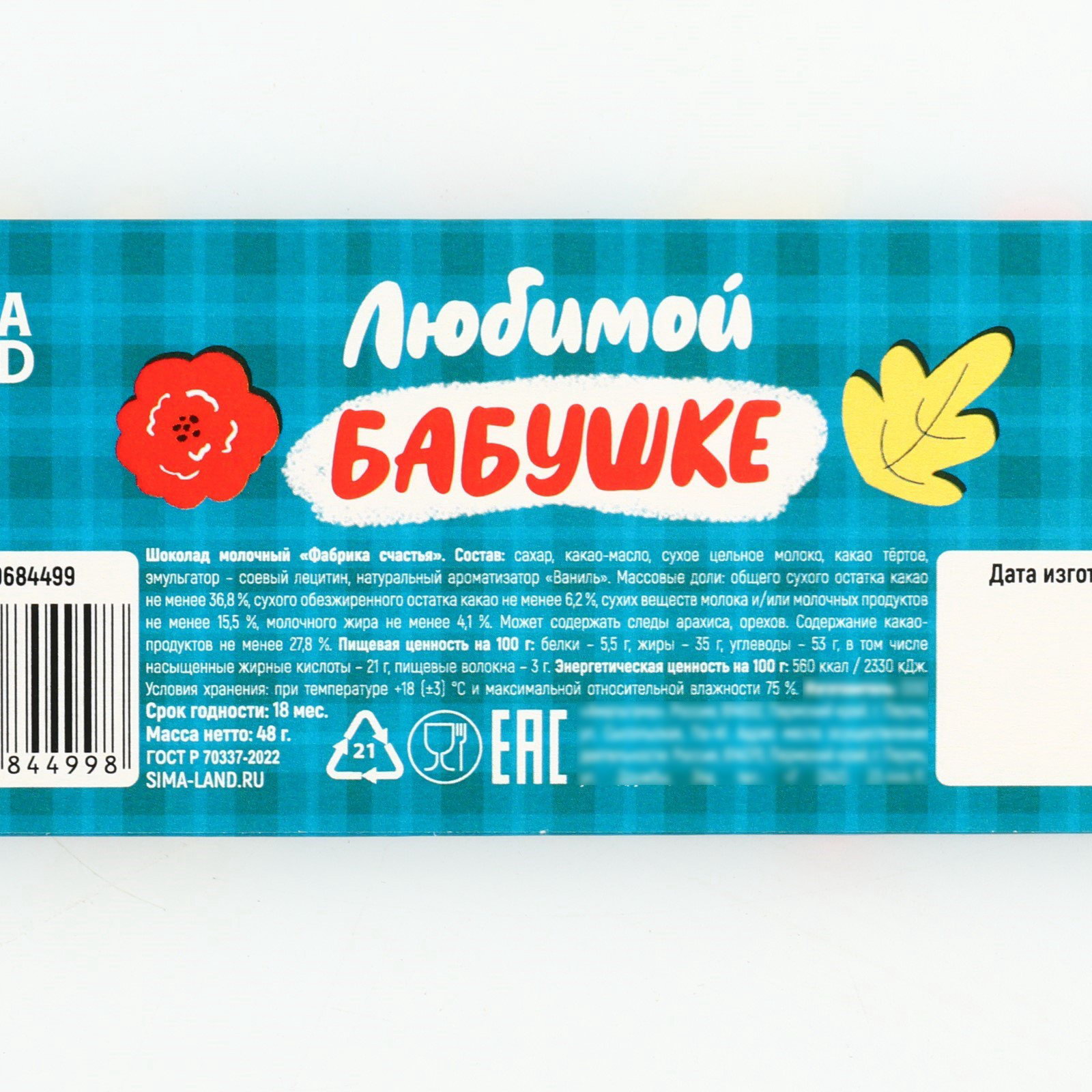 Шоколад мини молочный "Бабушке", 48 г, Фабрика счастья, Россия