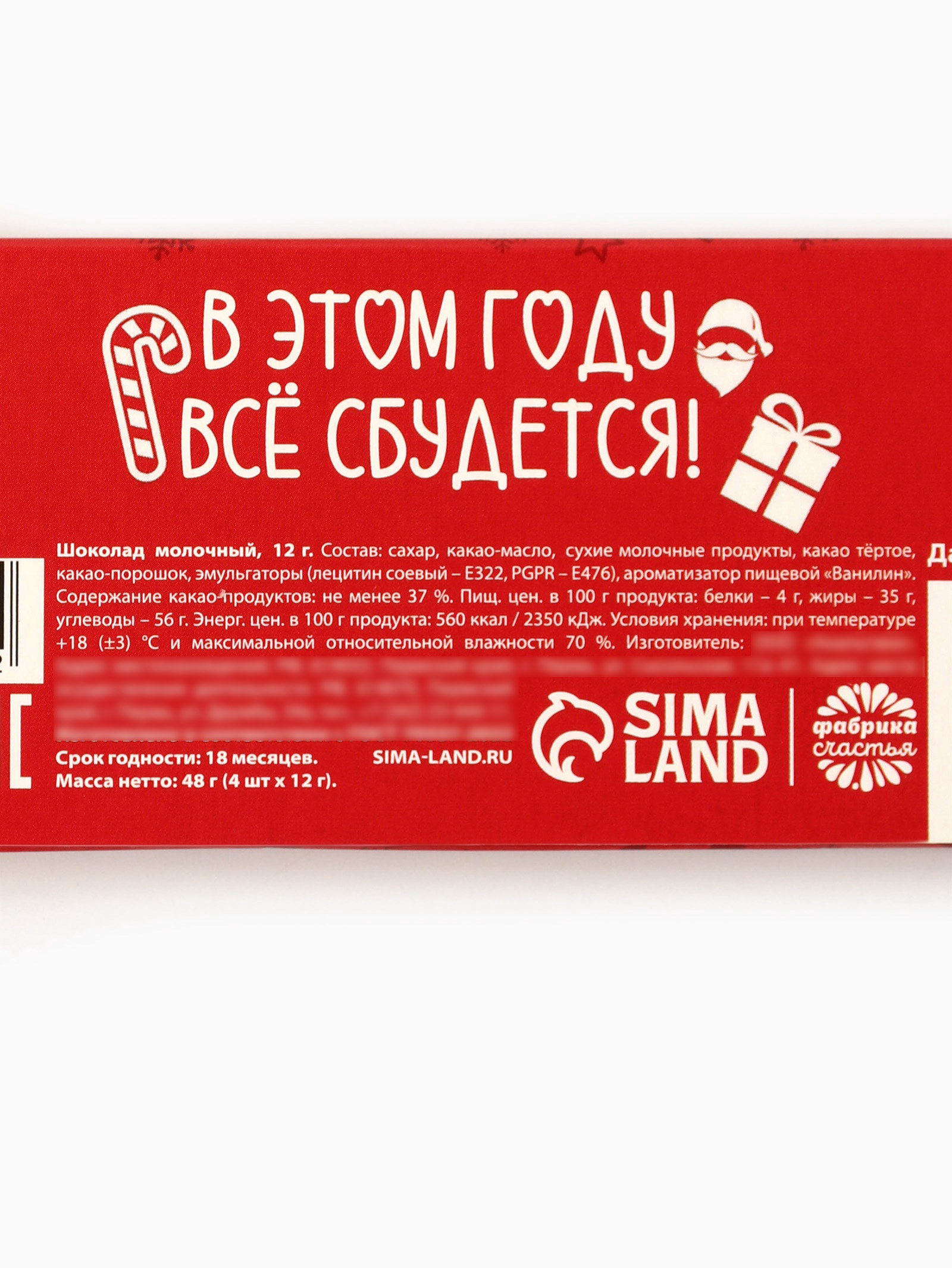 Запрет реализации по сегментам: 00000000266, 00000000593 Размер упаковки: 6 x 1 x 15 см. tnved: 1806310000 Набор: Да Новогодняя коллекция: Новый год Символ года: Символ года 2026 (Лошадь) Энергетическая ценность, ккал: 560 Белки, г: 5.5 Жиры, г: 35 Вид шоколада: Молочный Форма: Мини-плитка Добавки: Без добавок Углеводы, г: 53 Вес нетто, г: 48 Тематика праздника: Новый год ПРИ ОФОРМЛЕНИИ ЗАКАЗА, ПРОСИМ ЗАПРАШИВАТЬ АКТУАЛЬНЫЕ СРОКИ ГОДНОСТИ У МЕНЕДЖЕРА Состав: сахар, какао-масло, сухое цельное молоко, какао тёртое, эмульгатор - соевый лецитин, натуральный ароматизатор "Ванилин". Срок годности: 12 месяцев Масса нетто: 48 гр | ||