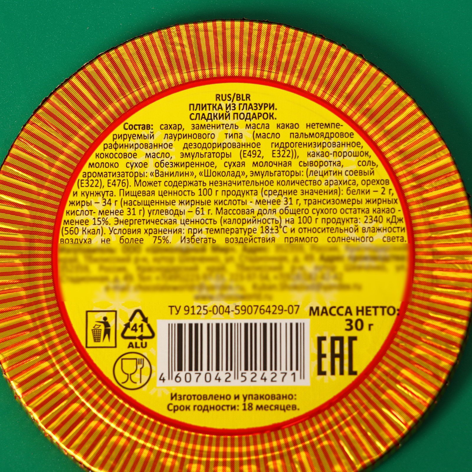 Тематика праздника: Новый год, Рождество Новогодняя коллекция: Новый год, Рождество Размер упаковки: 8 x 0.5 x 8 см. Символ года: Нет Тематика: Новогодняя Тематика: Новогодняя tnved: 1806909000 Продукты: Да Температурное ограничение: Нет Добавки: Без добавок Вид шоколада: Кондитерская глазурь Жиры, г: 34 Энергетическая ценность, ккал: 560 Белки, г: 2 Углеводы, г: 61 Вес нетто, г: 30 Форма: Медаль Шоколад в яркой и красочной упаковке, в виде старой елочной игрушки - это необычный, оригинальный сладкий подарок, который дарит неповторимые эмоции! Вам больше не нужно ломать голову над идеей подарка, мы все придумали за Вас. От шоколада просто невозможно оторваться. Как тут не станешь сладкоежкой! Состав: сахар, заменитель масла какао нетемперируемый лауринового типа (масло пальмоядровое рафинированное дезодорированное гидрогенизированное, кокосовое масло, эмульгаторы (Е492, Е322)), какао-порошок, молоко сухое обезжиренное, сухая молочная сыворотка, соль; ароматизаторы: "Ванилин", "Шоколад"; эмульгаторы: (лецитин соевый (Е322), Е476). Может содержать незначительное количество арахиса, орехов и кунжута. Пищевая ценность 100 г продукта (средние значения): белки - 2 г, жиры- 34 г (насыщенные жирные кислоты - менее 31 г, трансизомеры жирных кислот - менее 31 г) углеводы - 61 гр Массовая доля общего сухого остатка какао - менее 15%. Энергетическая ценность (калорийность) на 100 г продукта: 2340 кДж (560 Ккал). Условия хранения: при температуре 18±3℃ и относительной влажности воздуха не более 75%. Избегать воздействия прямого солнечного света. | ||