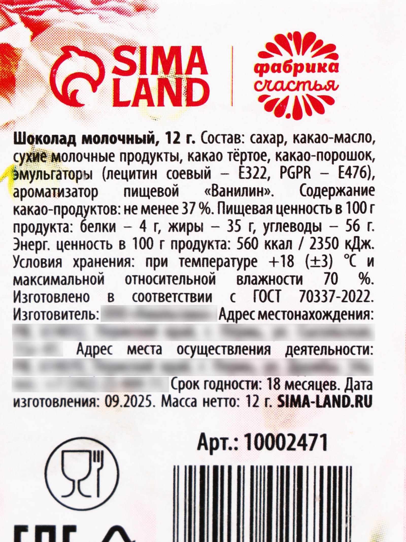 Запрет реализации по сегментам: 00000000266, 00000000593 Размер упаковки: 3.5 x 0.5 x 5.5 см. Форма: Мини-плитка Добавки: Без добавок Вид шоколада: Молочный Вес нетто, г: 12 Углеводы, г: 56 Энергетическая ценность, ккал: 560 Белки, г: 4 Жиры, г: 35 Тематика праздника: 8 Марта Вид упаковки: Бумажная обертка tnved: 1806201000 Тематика подарка: Продукты питания Адресат: Без адресата Набор: Нет Для кого: Для женщины ПРИ ОФОРМЛЕНИИ ЗАКАЗА, ПРОСИМ ЗАПРАШИВАТЬ АКТУАЛЬНЫЕ СРОКИ ГОДНОСТИ У МЕНЕДЖЕРА Состав: сахар, какао-масло, сухие молочные продукты, какао тёртое, какао-порошок, эмульгаторы (лецитин соевый - Е322, PGPR - T476), ароматизатор пищевой "Ванилин". Срок годности: 12 месяцев Масса нетто: 12 гр | ||
