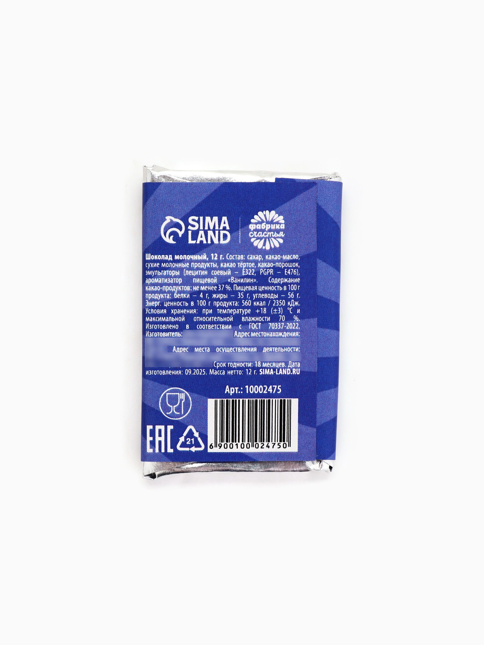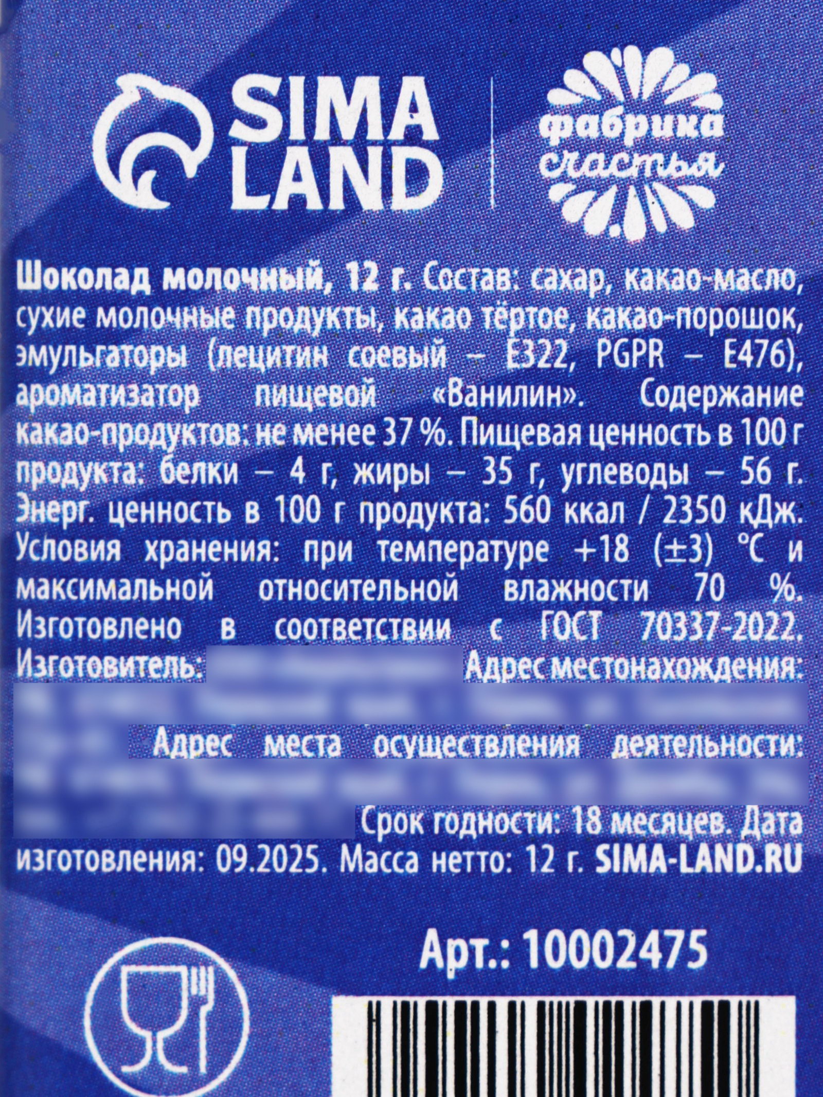 Запрет реализации по сегментам: 00000000266, 00000000593 Размер упаковки: 3.5 x 0.5 x 5.5 см. Добавки: Без добавок Вид шоколада: Молочный Форма: Мини-плитка Вес нетто, г: 12 Жиры, г: 35 Углеводы, г: 56 Энергетическая ценность, ккал: 560 Белки, г: 4 Тематика подарка: Продукты питания Тематика праздника: 23 Февраля tnved: 1806201000 Набор: Нет Для кого: Для мужчины Адресат: Без адресата ПРИ ОФОРМЛЕНИИ ЗАКАЗА, ПРОСИМ ЗАПРАШИВАТЬ АКТУАЛЬНЫЕ СРОКИ ГОДНОСТИ У МЕНЕДЖЕРА Состав: сахар, какао-масло, сухие молочные продукты, какао тёртое, какао-порошок, эмульгаторы (лецитин соевый - Е322, PGPR - T476), ароматизатор пищевой "Ванилин". Срок годности: 12 месяцев Масса нетто: 12 гр | ||