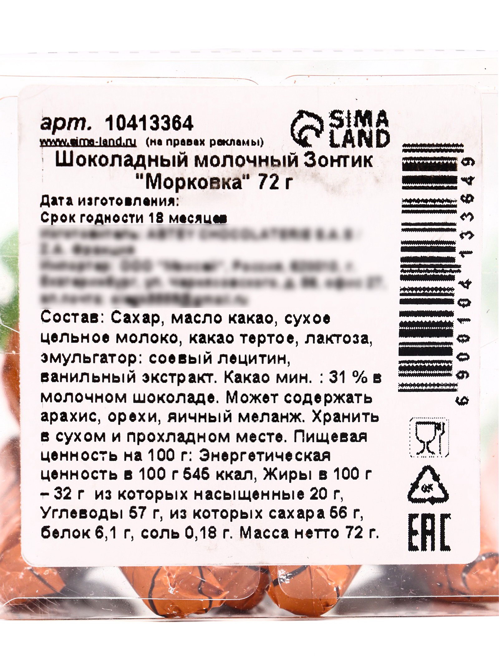 Зонтик шоколадный, бельгийский, молочный "Морковка", 72 г, Франция