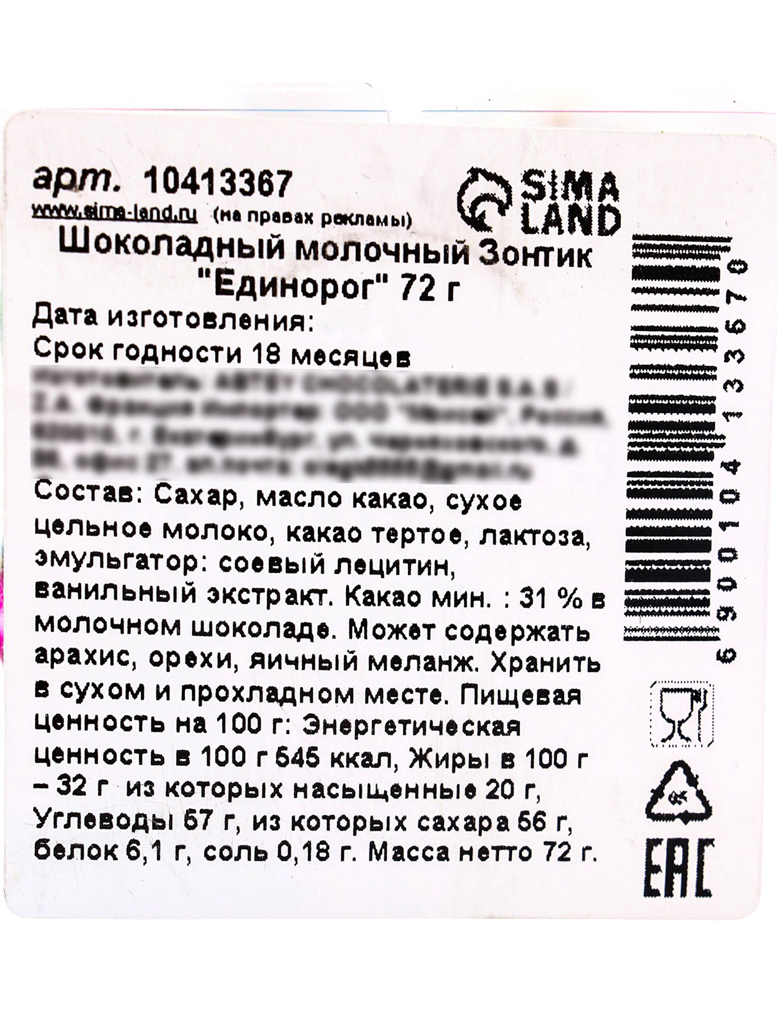 Зонтик шоколадный, бельгийский, молочный "Единорог" 72 г, Франция
