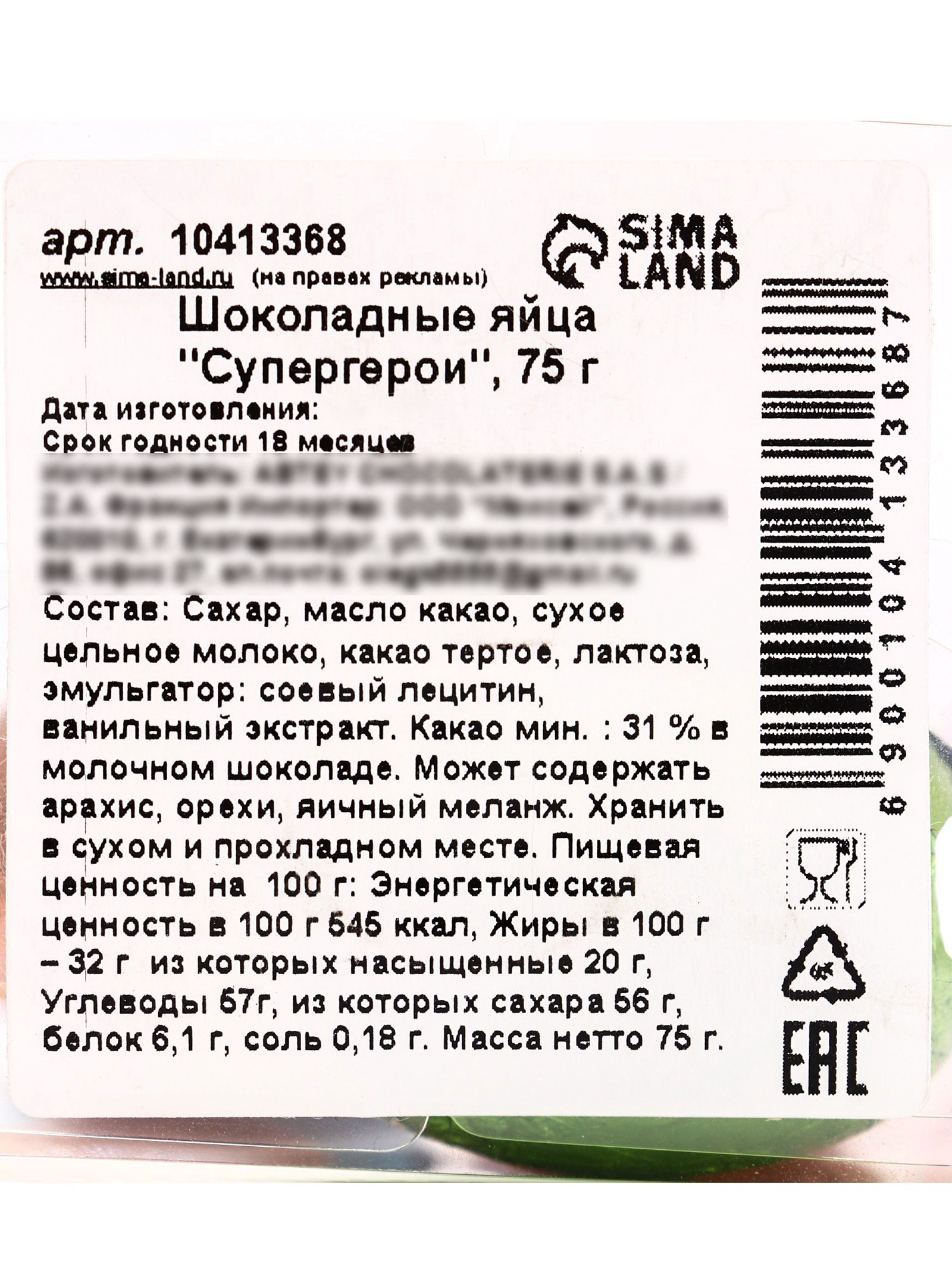 Яйца шоколадные, бельгийский, "Супергерои", 75 г, Франция