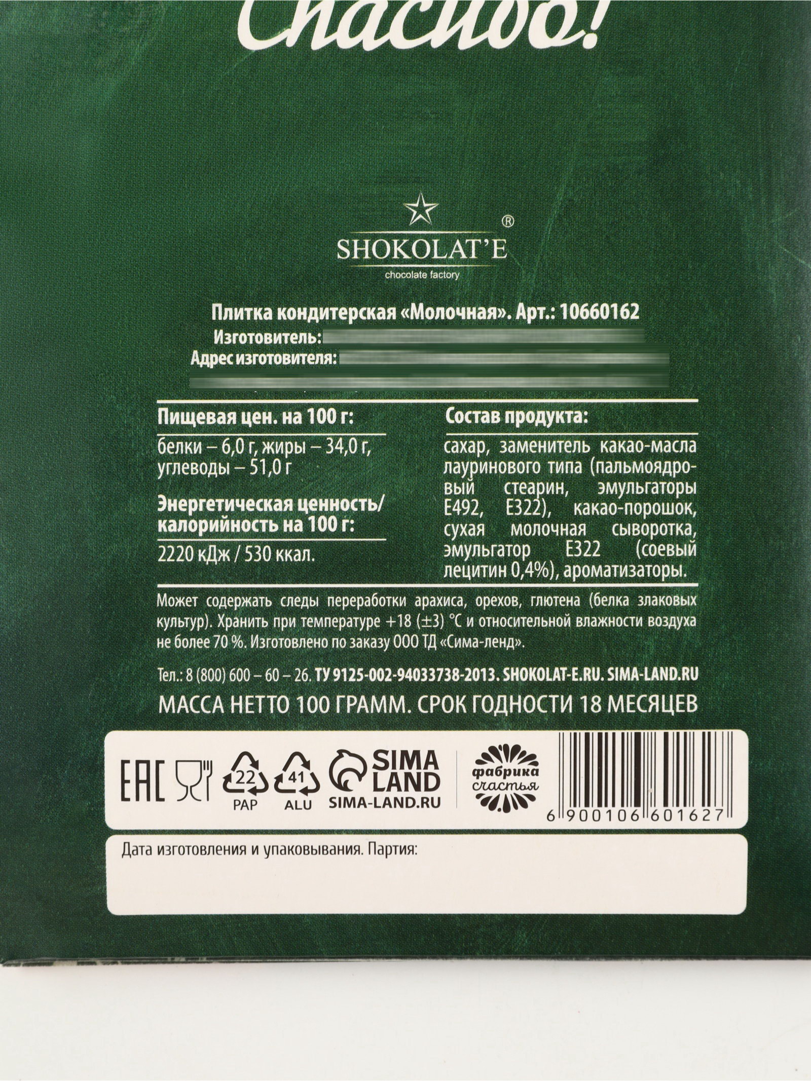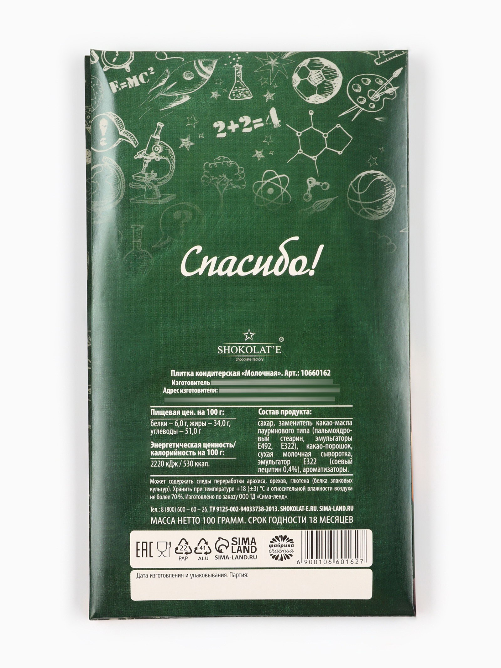 Запрет реализации по сегментам: 00000000266, 00000000593 Размер упаковки: 10.5 x 0.8 x 18.5 см. Жиры, г: 37 Белки, г: 4.5 Углеводы, г: 53 Вес нетто, г: 100 Энергетическая ценность, ккал: 560 Вид шоколада: Тёмный Добавки: Без добавок Форма: Плитка Срок годности, мес: 12 Адресат: Учителю Тематика праздника: День учителя tnved: 1806209500 ПРИ ОФОРМЛЕНИИ ЗАКАЗА, ПРОСИМ ЗАПРАШИВАТЬ АКТУАЛЬНЫЕ СРОКИ ГОДНОСТИ У МЕНЕДЖЕРА Состав продукта: сахар, заменитель какао-масла лауринового типа (пальмоядровый стеарин, эмульгаторы Е492, Е322), какао-порошок, сухая молочная сыворотка, эмульгатор Е322 (соевый лецитин 0,4%), ароматизаторы. Может содержать следы переработки арахиса, орехов, глютена (белка злаковых культур). Пищевая ценность на 100 г продукта: белки – 1,5 г, жиры – 33,0 г, углеводы – 62,0 гр Энергетическая ценность/калорийность: 2220 кДж / 530 ккал. | ||