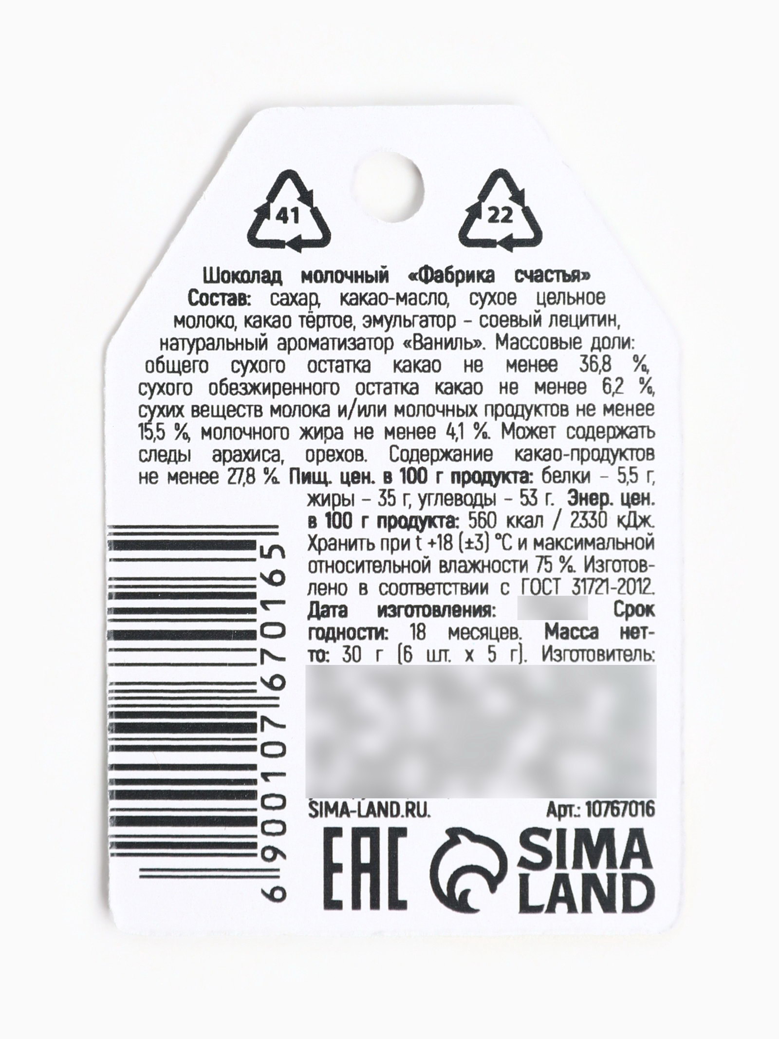 Запрет реализации по сегментам: 00000000266, 00000000593 Размер упаковки: 3.5 x 6 x 3.5 см. Вес нетто, г: 30 Форма: Мини-плитка Белки, г: 5.5 Энергетическая ценность, ккал: 560 Жиры, г: 35 Углеводы, г: 53 Вид шоколада: Молочный Добавки: Без добавок Срок годности, мес: 18 Тематика праздника: Универсальная тематика tnved: 1806201000 tnved: 1806201000 ПРИ ОФОРМЛЕНИИ ЗАКАЗА, ПРОСИМ ЗАПРАШИВАТЬ АКТУАЛЬНЫЕ СРОКИ ГОДНОСТИ У МЕНЕДЖЕРА Состав: сахар, какао-масло, сухое цельное молоко, какао тёртое, эмульгатор - соевый лецитин, натуральный ароматизатор "Ваниль". Масса нетто: 30г (6 шт x 5 г) Срок годности: 18 месяцев. | ||