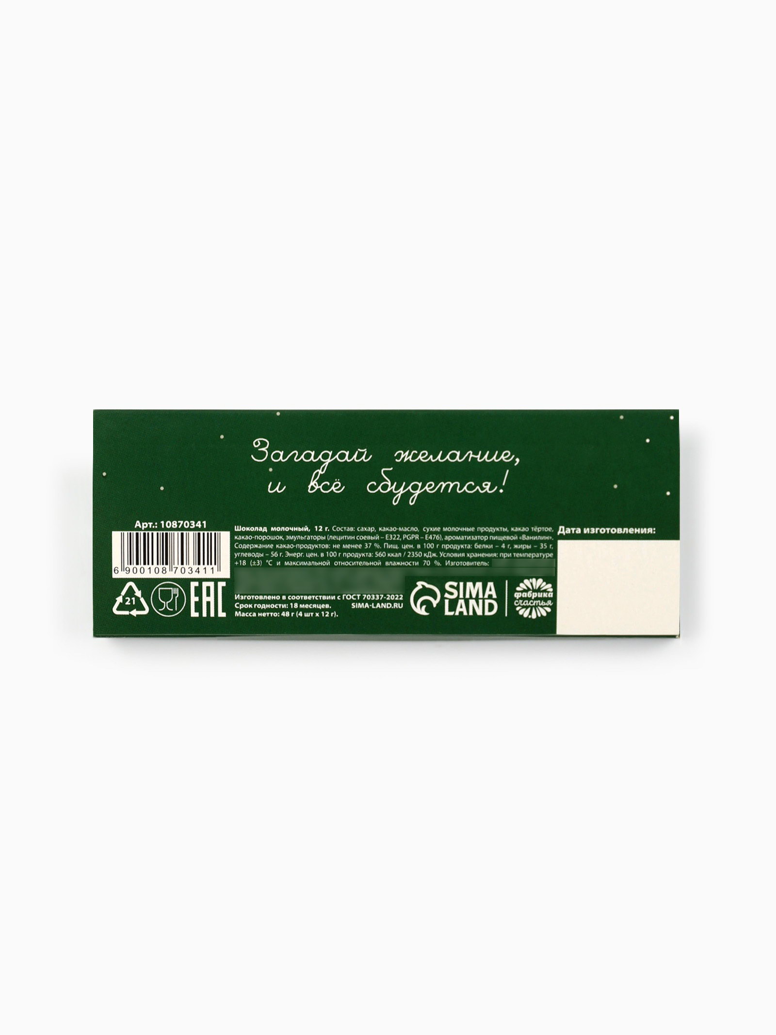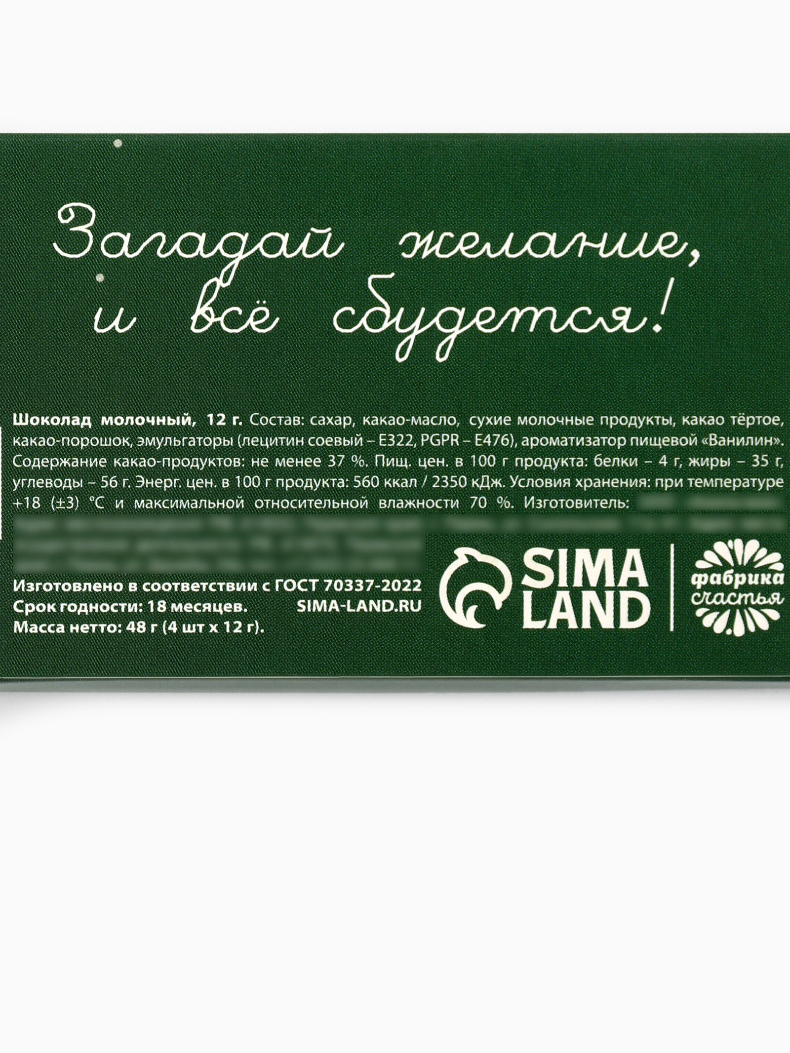 Размер упаковки: 6 x 1 x 15 см. tnved: 1806903000 Запрет реализации по сегментам: 00000000266 Вес нетто, г: 48 Белки, г: 4 Энергетическая ценность, ккал: 560 Жиры, г: 35 Углеводы, г: 56 Форма: Мини-плитка Добавки: Без добавок Вид шоколада: Молочный Тематика праздника: Новый год Символ года: Нет Набор: Да Новогодняя коллекция: Новый год ПРИ ОФОРМЛЕНИИ ЗАКАЗА, ПРОСИМ ЗАПРАШИВАТЬ АКТУАЛЬНЫЕ СРОКИ ГОДНОСТИ У МЕНЕДЖЕРА Состав: сахар, какао-масло, сухие молочные продукты, какао тёртое, какао-порошок, эмульгаторы (лецитин соевый - Е322, PGPR - E476), ароматизатор пищевой "Ванилин". Содержит какао-продуктов: не менее 37 %. Пищевая ценность в 100 г в продуктах: белки - 4 г, жиры - 35 г, углеводы - 56 гр Энергетическая ценность в 100 г продукта: 560 ккал/2350 кДж. Срок годности: 18 месяцев. Масса нетто: 48 г (4 шт. x 12 г). | ||