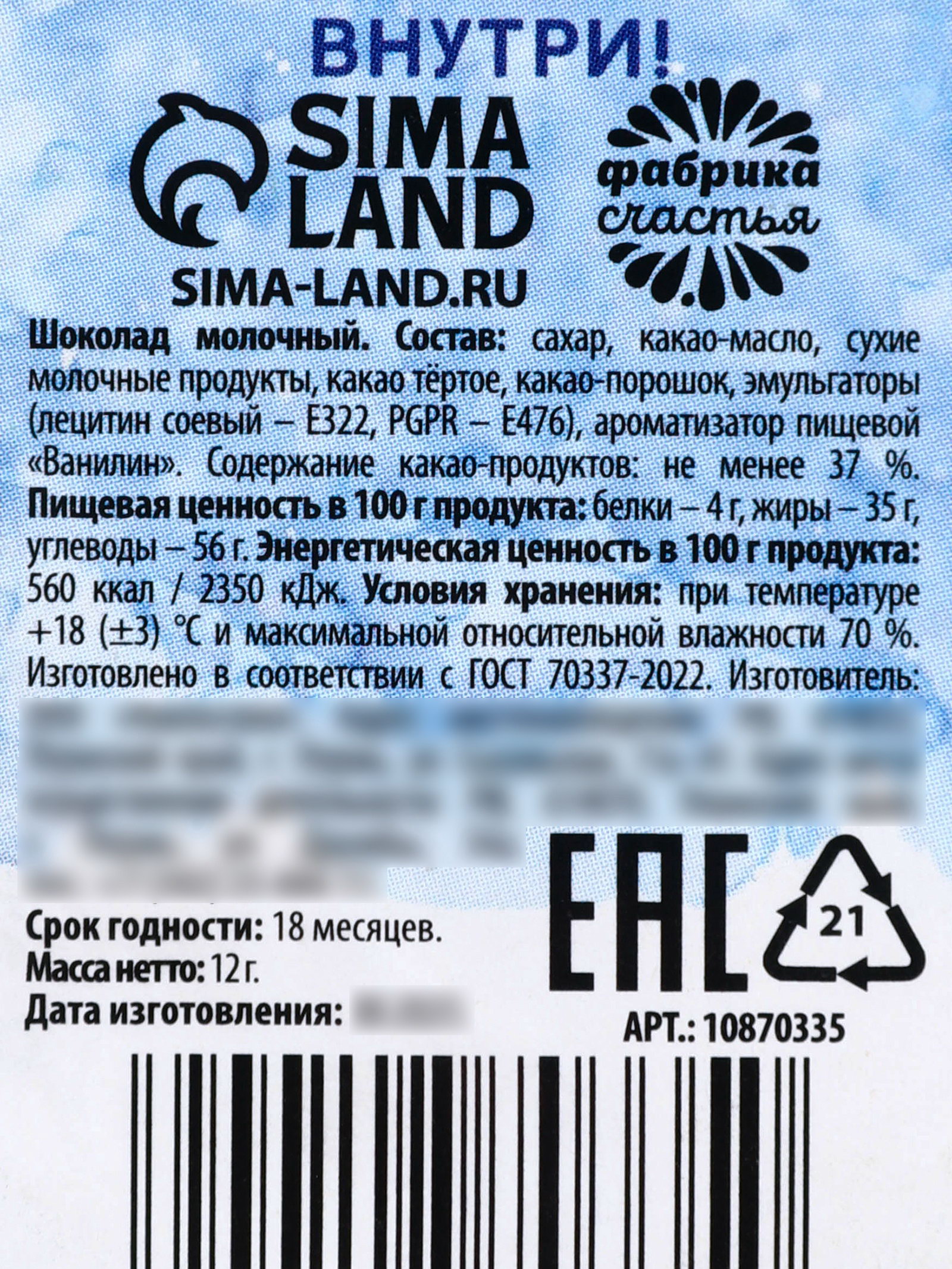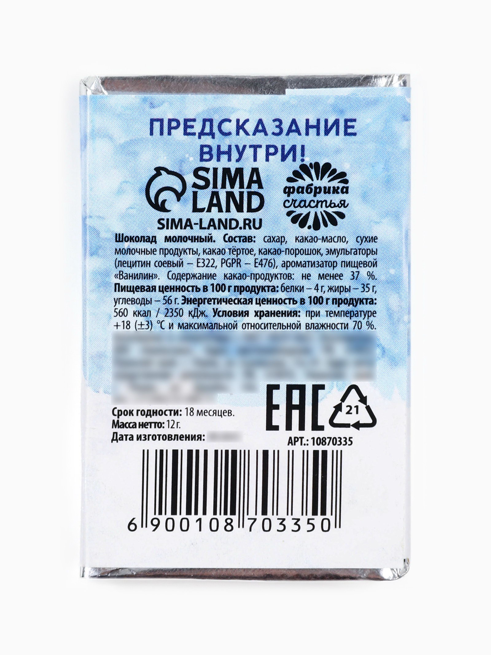 Новогодний шоколад "С новым годом", 12 г, Фабрика счастья, Россия