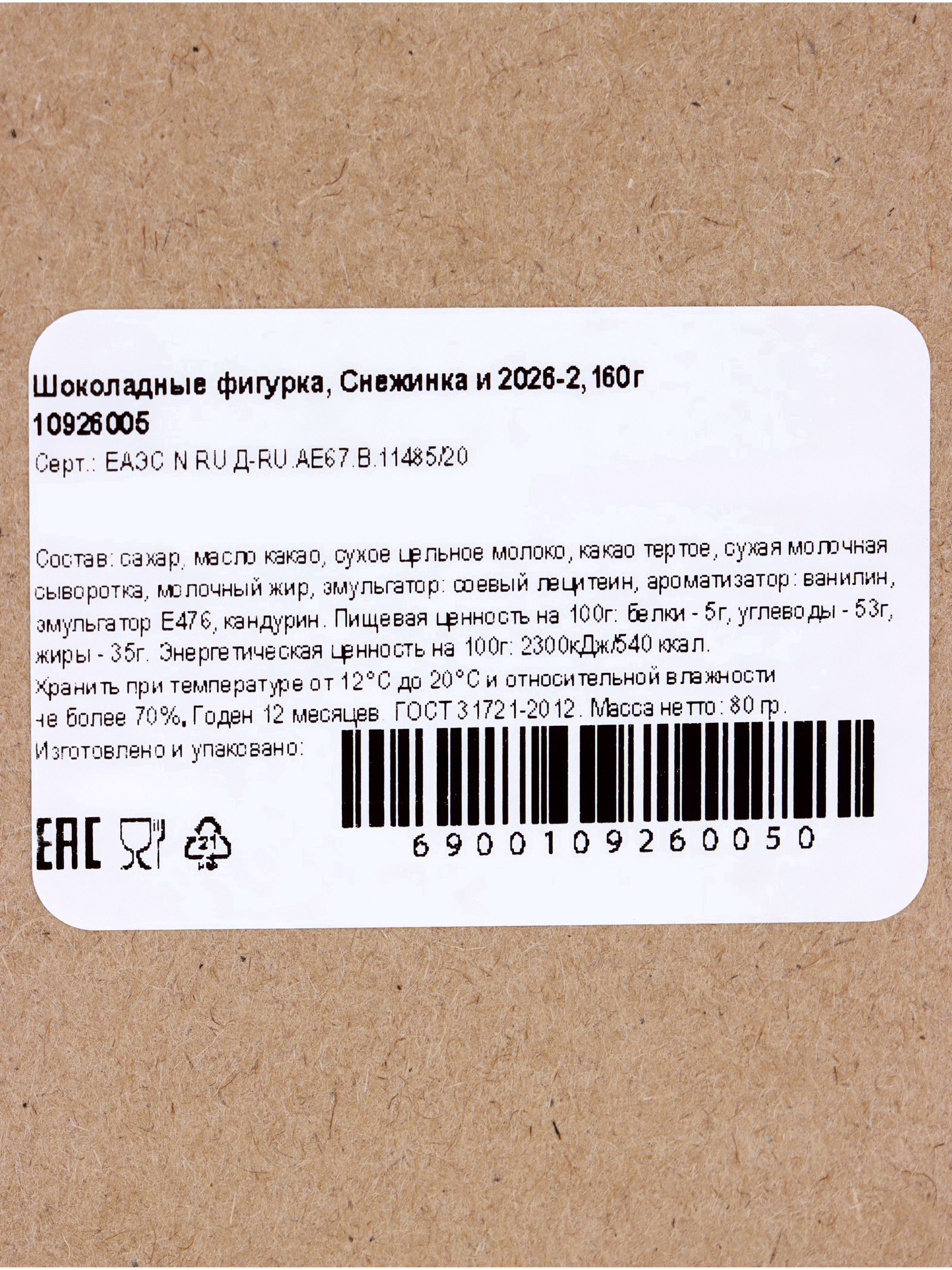 Шоколадная фигурка "Снежинка 2026", бельгийский шоколад, 160 г, Россия