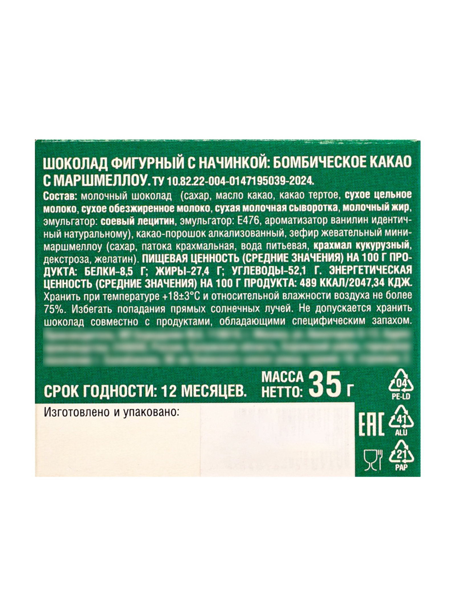Новогодняя коллекция: Новый год, Рождество Тематика праздника: Новый год, Рождество Размер упаковки: 7.5 x 6.5 x 7.5 см. tnved: 1806909000 Продукты: Да Температурное ограничение: Нет Вес нетто, г: 35 Белки, г: 8.5 Вид шоколада: Молочный Символ года: Нет Форма: Шар Жиры, г: 27.4 Углеводы, г: 52.1 Энергетическая ценность, ккал: 489 Добавки: С маршмеллоу Волшебство в вашей чашке от главного зимнего волшебника Шоколадная бомбочка "Дед Мороз" с маршмеллоу создаёт настоящую новогоднюю сказку. Молочный шар весом 35 г с тематическим дизайном превращает приготовление какао в праздничный ритуал для детей.
