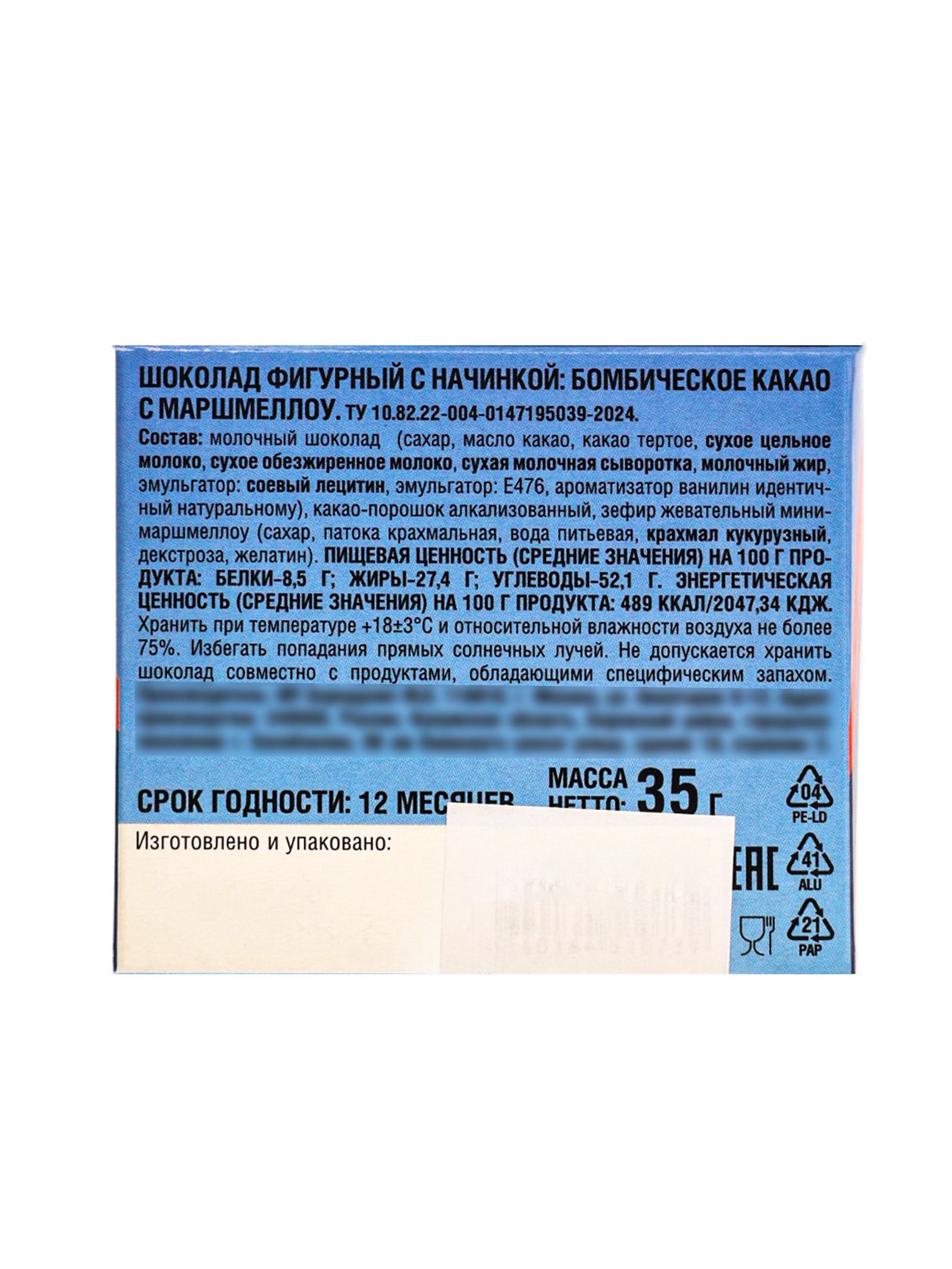 Новогодняя коллекция: Новый год, Рождество Тематика праздника: Новый год, Рождество Размер упаковки: 7.5 x 7 x 7.5 см. tnved: 1806909000 Продукты: Да Температурное ограничение: Нет Символ года: Нет Форма: Шар Жиры, г: 27.4 Белки, г: 8.5 Углеводы, г: 52.1 Энергетическая ценность, ккал: 489 Вес нетто, г: 35 Вид шоколада: Молочный Добавки: С маршмеллоу Арктический гость в вашей чашке Шоколадная бомбочка "Пингвин" с маршмеллоу приносит атмосферу зимнего приключения. Молочный шар весом 35 г с забавным дизайном превращает вечернее какао в небольшое путешествие на Южный полюс.