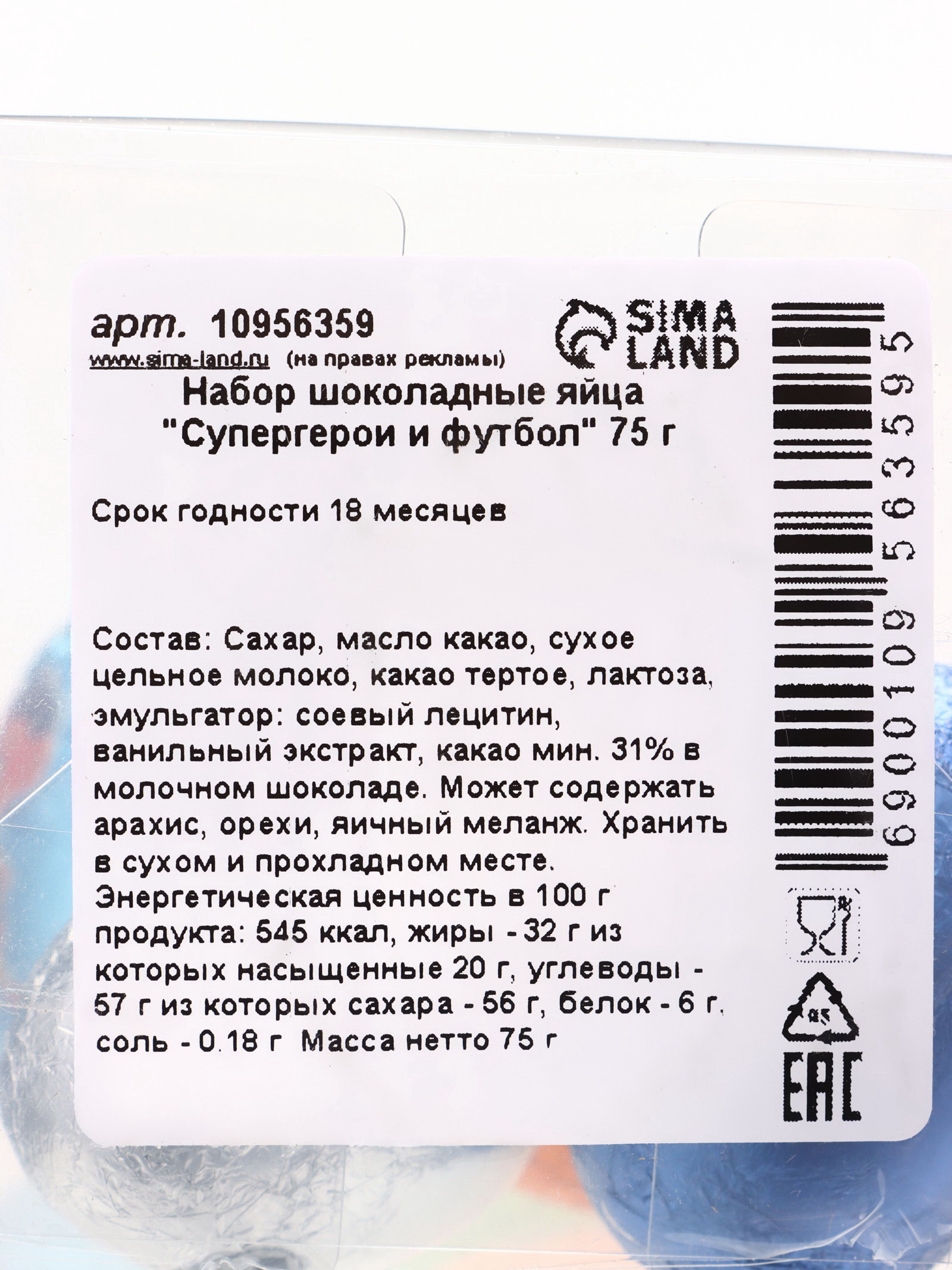 Размер упаковки: 8.5 x 12 x 8.5 см. tnved: 1806329000 Продукты: Да Вид шоколада: Кондитерская глазурь Вес нетто, г: 75 Тематика праздника: Пасха Этот набор для тех, кто хочет сделать детский праздник особенным. Он объединяет две популярные темы: силу супергероев и азарт футбола в одном сладком сюрпризе. Каждое яйцо в яркой фольге становится маленьким подарком, который можно вручить гостям или использовать как приз в игре. Что входит в набор