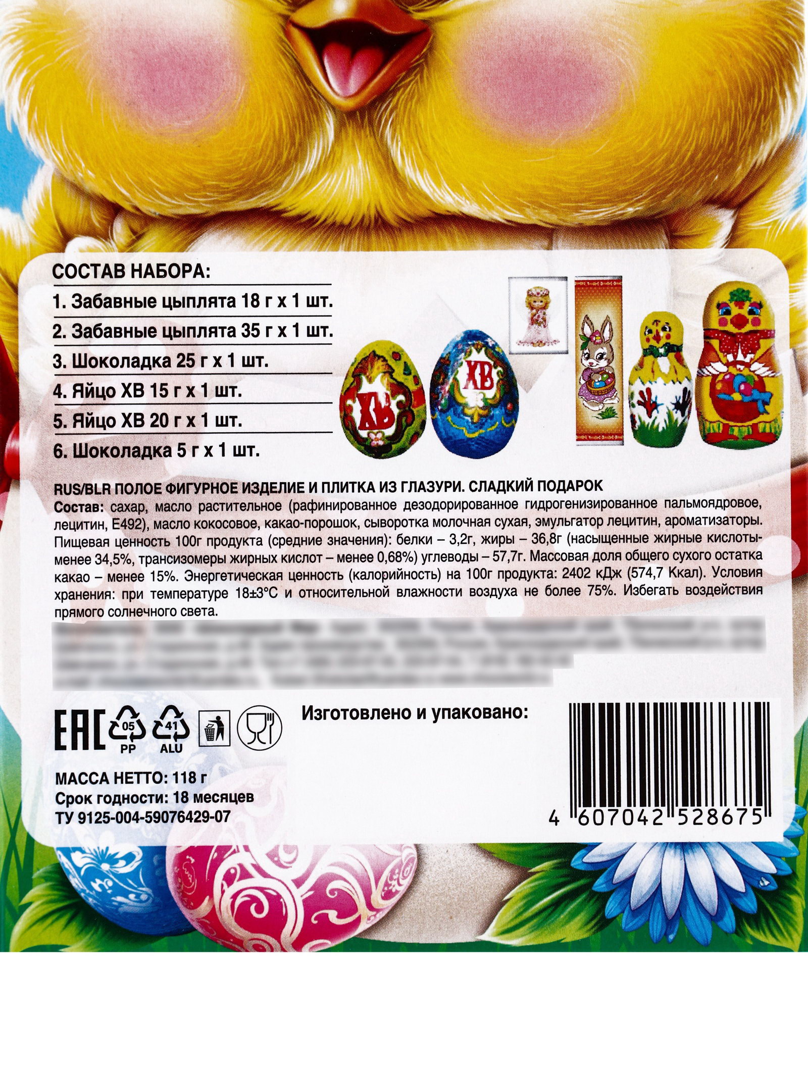Размер упаковки: 15.5 x 5 x 24.5 см. tnved: 1806329000 Продукты: Да Вид шоколада: Кондитерская глазурь Тематика праздника: Пасха Вес нетто, г: 118 Этот набор с цыплёнком создан для тех, кто ищет не просто сладость, а символ обновления и начала. Цыплёнок один из самых трогательных образов Пасхи, олицетворяющий новую жизнь. Вместе с другими фигурками он составляет гармоничную композицию, которая дарит чувство весенней радости. Состав и оформление