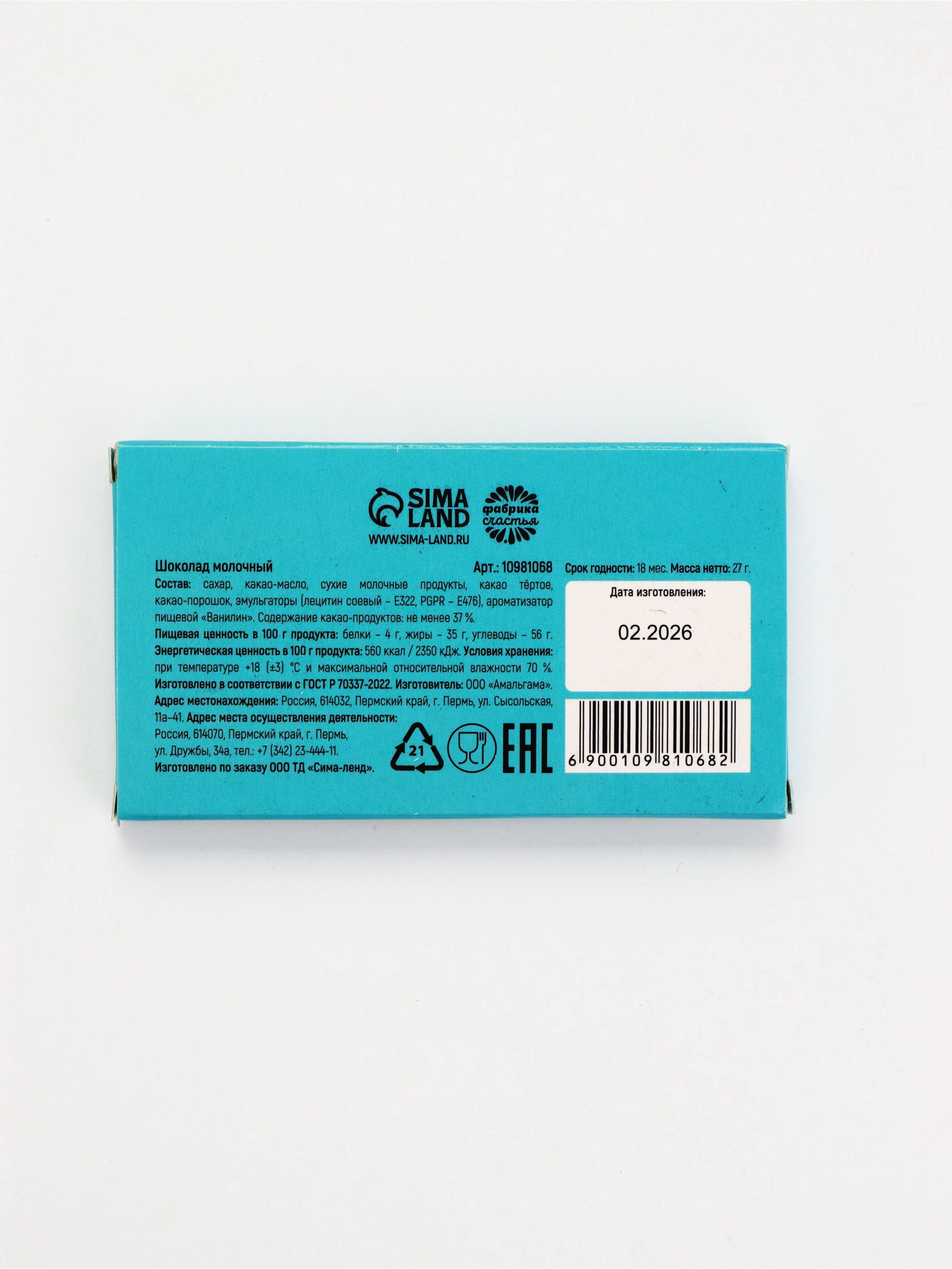 Размер упаковки: 1 x 5.2 x 9.2 см. tnved: 1806901900 Запрет реализации по сегментам: 00000000266 Тематика праздника: Универсальная тематика Форма: Плитка Добавки: Без добавок Вид шоколада: Молочный Жиры, г: 35 Вес нетто, г: 27 Углеводы, г: 56 Энергетическая ценность, ккал: 560 Белки, г: 4 Мини-шоколад для макси-настроения! Молочный шоколад в ультраприкольной упаковке чтобы поднять себе дух за 27 граммов счастья! Добавьте немного юмора и сладости в свою жизнь! Выбирайте свою мини-шоколадку и наслаждайтесь моментом! | ||