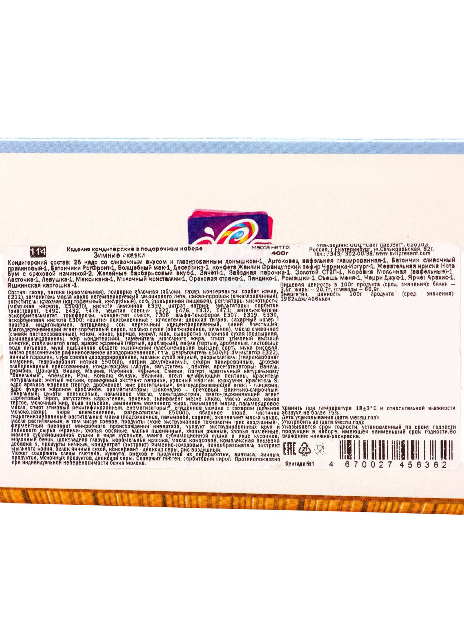 Тематика праздника: Новый год, Рождество Новогодняя коллекция: Новый год, Рождество Составляющие набора: Конфеты, Раскраска Адресат: Девочке, Мальчику Размер упаковки: 8.5 x 26 x 17 см. tnved: 1806901900 Продукты: Да Температурное ограничение: Нет В наборе, шт.: 25 Вес нетто, г: 400 Для кого: Унисекс Вид упаковки: Коробка картонная Возраст: Для детей Тематика подарка: Продукты питания Цвет: МИКС Новый год начинается со сладкой сказки! Подарочный набор "Зимние сказки" (400 г) - это готовое решение для праздничного угощения. Универсальный вариант для детей: 25 конфет в яркой коробке подойдут для утренника, домашнего торжества или как часть подарочного набора.