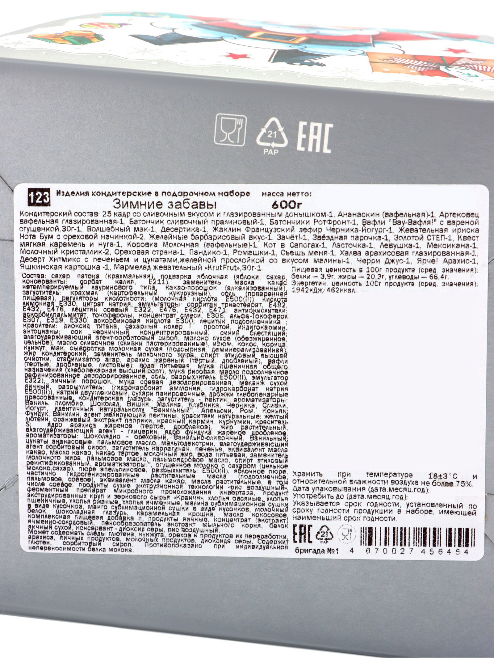 Для кого этот набор: "Зимние забавы" хороший выбор для тех, кто ищет готовый сладкий подарок на Новый год. Простая упаковка, оптимальный вес и разнообразие угощений делают его практичным решением для детских мероприятий и праздничных сюрпризов в кругу семьи. | ||