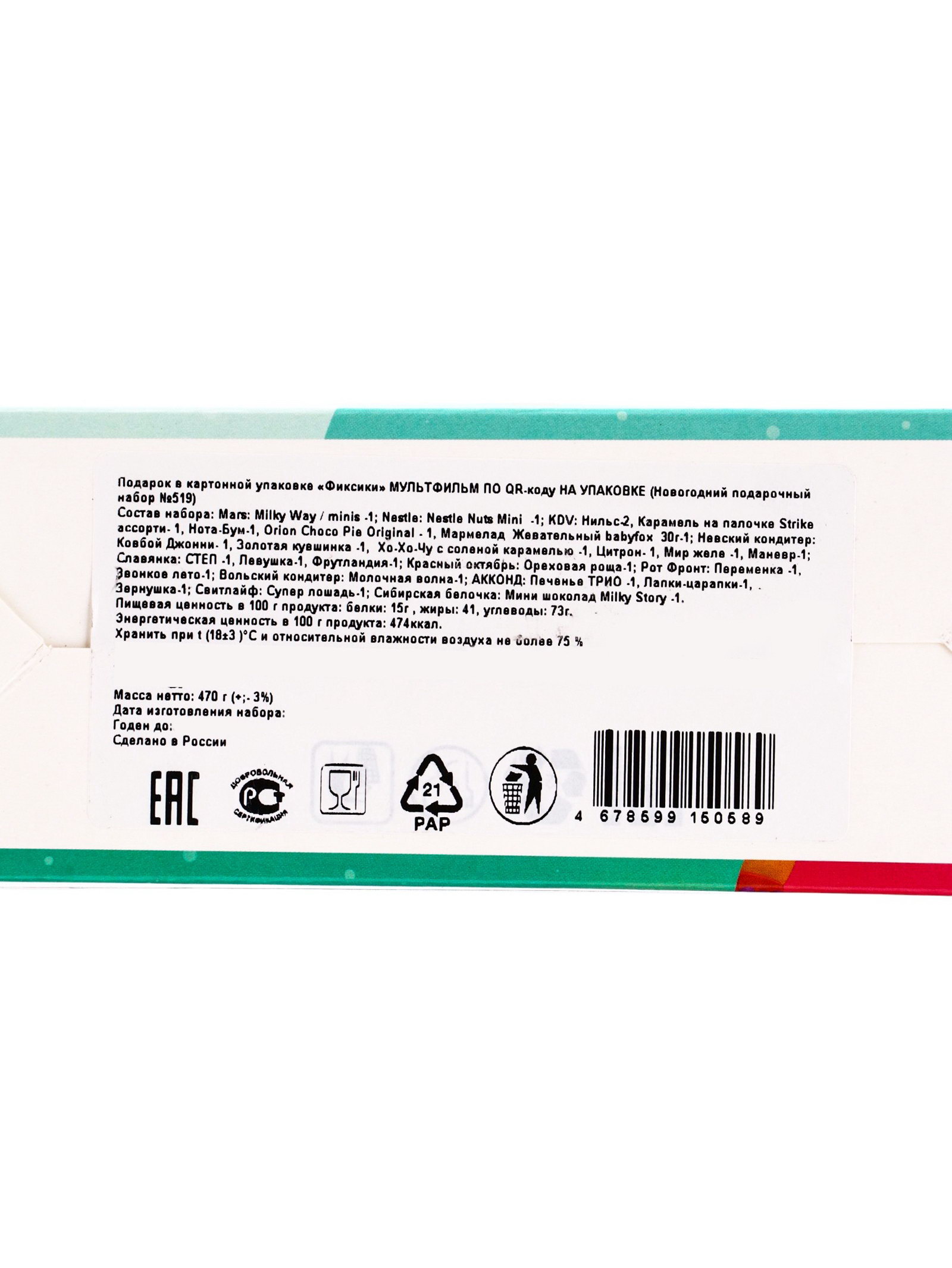 Тематика праздника: Новый год, Рождество Новогодняя коллекция: Новый год, Рождество Размер упаковки: 18 x 6 x 19.5 см. tnved: 1806201000 Составляющие набора: Конфеты Вид упаковки: Картонная упаковка В наборе, шт.: 26 Продукты: Да Вес нетто, г: 470 Цвет: МИКС Температурное ограничение: Нет Новогодний подарок с Фиксиками создан для детей, которые обожают разгадывать загадки и верить в чудеса. Эта коробка со сладостями становится продолжением любимой истории здесь даже обычные конфеты превращаются в часть большого приключения. Что ждёт внутри