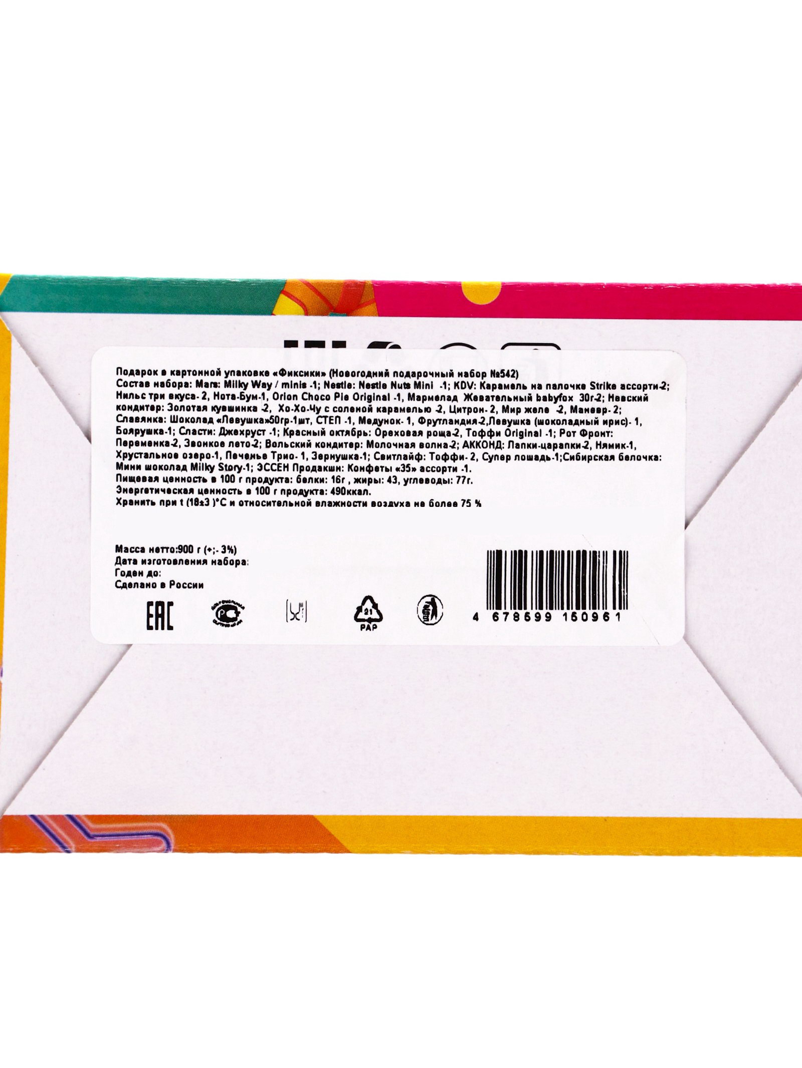 Тематика праздника: Новый год, Рождество Новогодняя коллекция: Новый год, Рождество Размер упаковки: 15 x 9.5 x 23 см. tnved: 1806905000 Цвет: МИКС Составляющие набора: Конфеты Вид упаковки: Коробка картонная В наборе, шт.: 49 Продукты: Да Вес нетто, г: 900 Большой новогодний подарок с Фиксиками создан для настоящих поклонников приключений Нолика и Симки. Эта коробка станет главным сладким открытием под ёлкой здесь каждая конфета превращается в деталь большого праздничного механизма. Что найдёте внутри