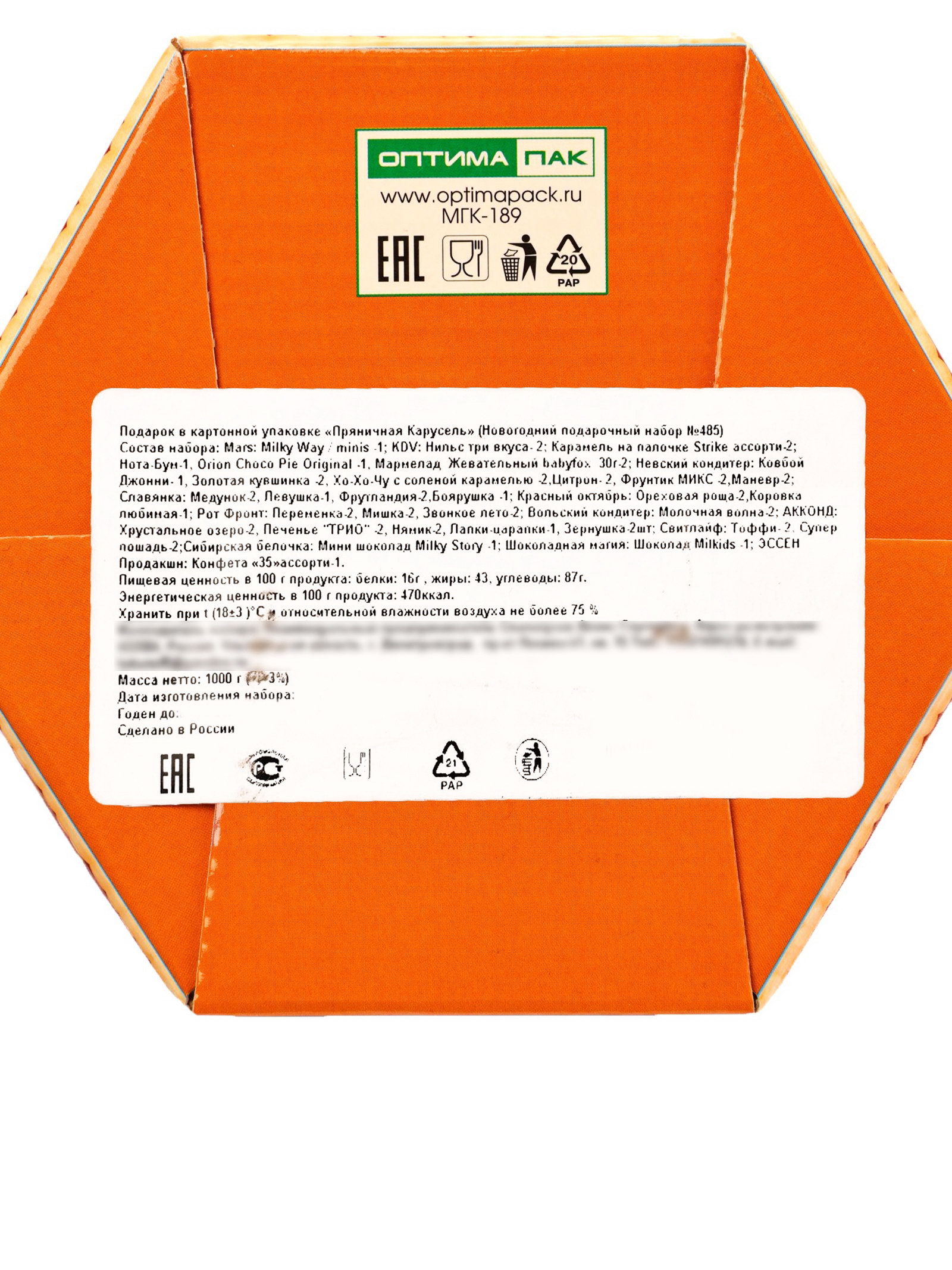 Новогодняя коллекция: Новый год, Рождество, Символ года 2026 Тематика праздника: Новый год, Рождество Размер упаковки: 15 x 13 x 20.5 см. tnved: 1806201000 Продукты: Да Температурное ограничение: Нет Цвет: Разноцветный В наборе, шт.: 53 Вид упаковки: Коробка картонная Вес нетто, г: 1000 Составляющие набора: Конфеты Новогодний подарок "Пряничная карусель" весом 1000 г создаёт атмосферу весёлого карнавала. Картонная коробка с карусельным дизайном передаёт ощущение движения и праздничного веселья.
