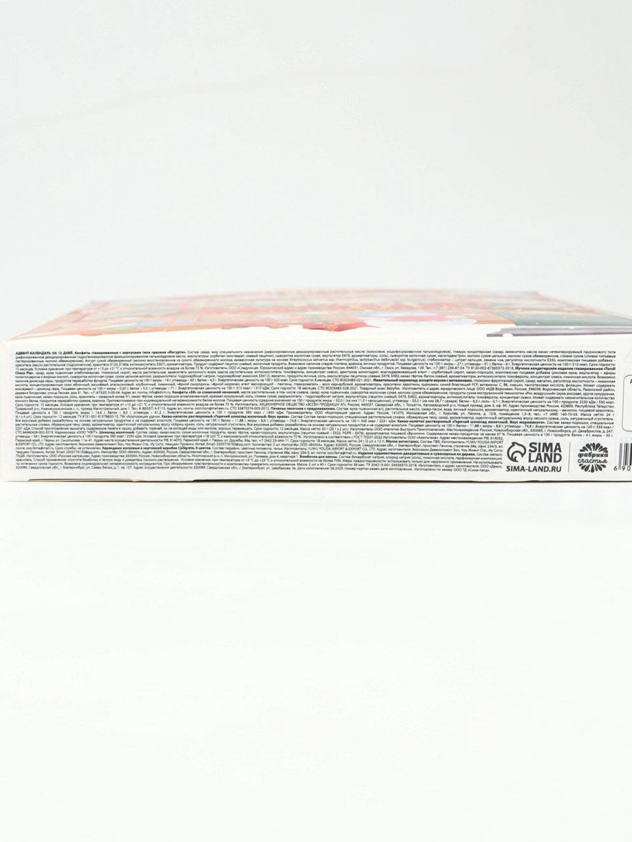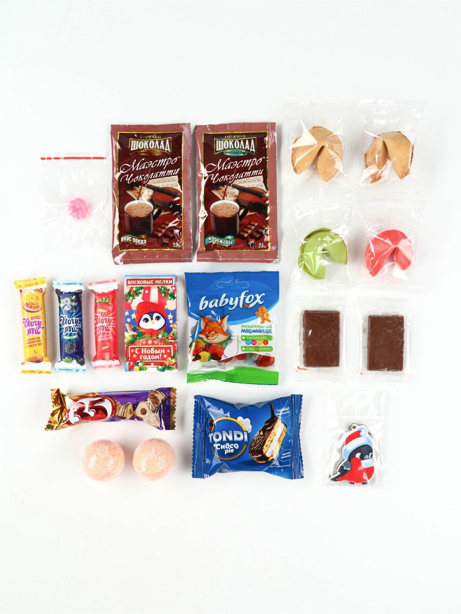 Для кого: Для девочки, Для мальчика Вид: Жевательные, Шоколадные Размер упаковки: 27 x 7 x 41.5 см. tnved: 3401300000 Запрет реализации по сегментам: 00000000266 Адресат: Без адресата Тематика праздника: Новый год Возраст: Для детей Тематика подарка: Продукты питания В наборе, шт.: 19 Вес нетто, г: 140 Вкус: Ассорти Цвет: Разноцветный Вид упаковки: Подарочная коробка Составляющие набора: Сладости Новогодняя коллекция: Новый год Конфеты глазированные с корпусами по типу пралине "Йогурти" Состав: сахар, жир специального назначения (рафинированные дезодорированные растительные масла (кокосовое, модифицированное пальмоядровое), глазурь кондитерская (сахар, заменитель масла какао нетемперируемый лауринового типа (рафинированное дезодорированное гидрогенизированное фракционированное пальмоядровое масло, эмульгаторы: сорбитан тристеарат, соевый лецитин), сыворотка молочная сухая, эмульгатор Е476, ароматизаторы, соль), сыворотка молочная сухая, мальтодекстрин, молоко сухое цельное, молоко сухое обезжиренное, сливки сухие (сливки питьевые пастеризованные, молоко обезжиренное), йогурт сухой обезжиренный (молоко восстановленное из сухого обезжиренного молока, заквасочная культура на основе Streptococcus salivarius ssp. thermophilus, lactobacillus delbrueckii ssp. bulgaricus), стабилизатор – цитрат кальция, семена чиа, регулятор кислотности Е330, комплексная пищевая добавка – краситель (масло растительное (подсолнечное), красители Е120, Е160а, антиокислитель Е307), ароматизаторы. Продукт содержит лецитин соевый, молочные продукты. Возможно наличие следов глютена, арахиса, яичных продуктов. Мучное кондитерское изделие глазированное "Tondi Choco Pie" Cостав: сахар, мука пшеничная хлебопекарная, глюкозный сироп, масла растительные, заменитель молочного жира (масла растительные, антиокислитель: токоферолы, концентрат смеси), декстроза моногидрат, влагоудерживающий агент – сорбитовый сироп, какао-порошок, комплексная пищевая добавка (рисовая мука, эмульгатор – эфиры полиглицерина и жирных кислот), сыворотка молочная сухая, сухое цельное молоко, разрыхлители: гидрокарбонат натрия, гидрокарбонат аммония, Е341(i); желатин, продукты яичные, соль, эмульгаторы: лецитины соевые, Е476, Е492; какао тёртое, белок соевый, ароматизаторы, антиокислители: токоферолы, концентрат смеси, лимонная кислота. Возможно наличие диоксида серы, продуктов переработки фундука. Жевательный мармелад: ассорти вкусов с витаминами Состав: глюкозно-фруктозный сироп, сахар, желатин, регулятор кислотности – лимонная кислота, концентрированные соки: яблочный, вишнёвый, апельсиновый, клубничный, лимонный, чёрной смородины, чёрной моркови; агент желирующий – пектины, глазирователь – воск карнаубский, ароматизаторы, красители: каротины, куркумин, синий блестящий FCF; витамины: С, В6, ниацин, пантотеновая кислота, фолацин. Может содержать консервант – диоксид серы. Конфеты "35" со сливочной начинкой Состав: масла растительные, в том числе соевое, сахар, мука пшеничная, сыворотка молочная сухая, молоко сухое обезжиренное, продукты сухие экструзионной технологии "Рис воздушный" (мука рисовая, крупа кукурузная, мука пшеничная, какао-порошок, соль, краситель – сахарный колер IV), какао тёртое, какао-порошок алкализованный, крахмал кукурузный, соль, сливки сухие, разрыхлитель – гидрокарбонат натрия, эмульгаторы (лецитин соевый, Е476, Е492), ароматизаторы, анти