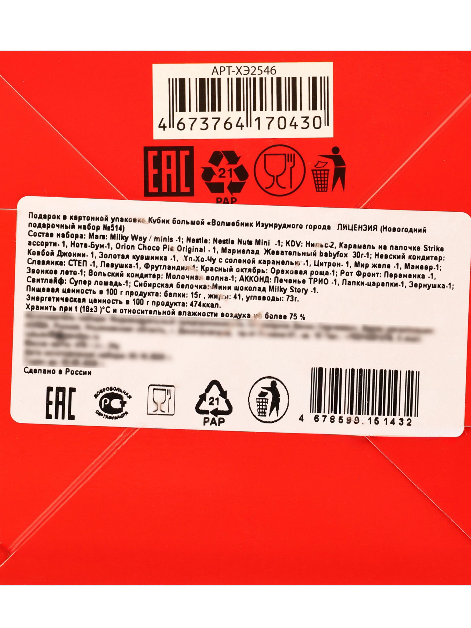 Новогодняя коллекция: Новый год, Рождество Тематика праздника: Новый год, Рождество Размер упаковки: 12 x 12 x 12 см. tnved: 1806201000 Продукты: Да Температурное ограничение: Нет Вес нетто, г: 470 Цвет: МИКС Вид упаковки: Коробка картонная В наборе, шт.: 26 Составляющие набора: Конфеты | ||