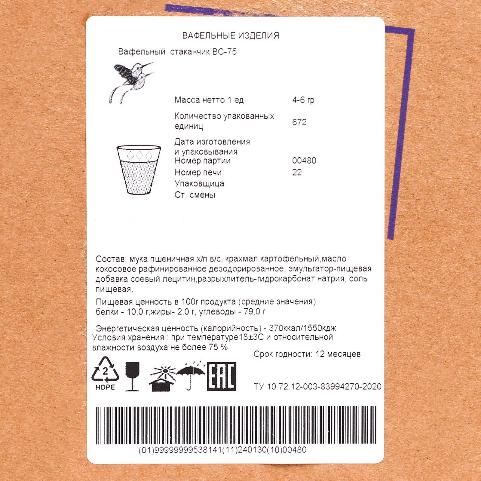 Вафельный стаканчик классический с усиленным дном, 672 шт., Россия