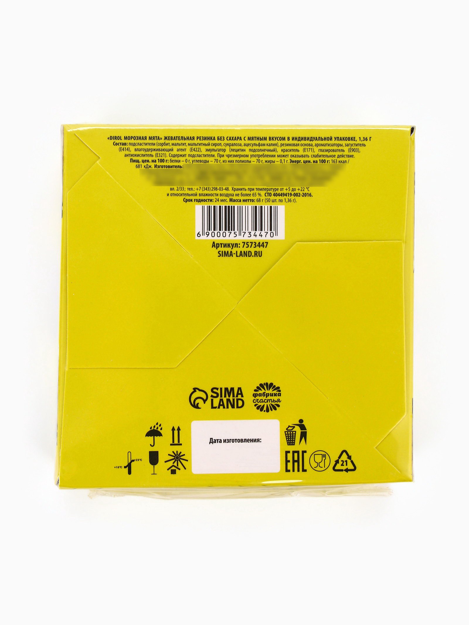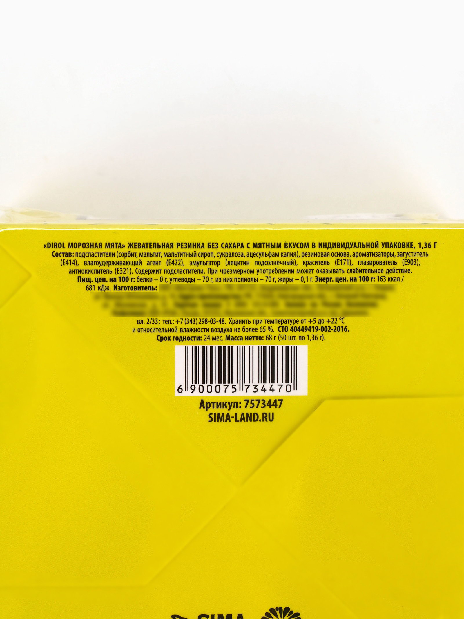 Запрет реализации по сегментам: 00000000266, 00000000593 Размер упаковки: 2.5 x 5 x 1 см. Темпер. ограничение НЕ ВЫШЕ ℃: +18 Форма: Подушечка Срок годности, мес: 24 Индивидуальная упаковка: Да Тематика праздника: Универсальная тематика tnved: 1704101000 tnved: 1704101000 Температурное ограничение: Нет Вкус: Мята С жидким центром: Нет Вес нетто, г: 68 При оформление заказа, просим запрашивать актуальные сроки годности у менеджераСостав: подсластители (сорбит, мальтит, мальтитный сироп, сукралоза, ацесульфам калия), резиновая основа, ароматизаторы, загуститель (Е414), влагоудерживающий агент (Е422), эмульгатор (лецитин подсолнечный), краситель (Е171), глазирователь (Е903), антиокислитель (Е321). Содержит подсластители. При чрезмерном употреблении может оказывать слабительное действие. Срок годности: 24 мес. Масса нетто: 68 г (50 шт. по 1,36 г) | ||