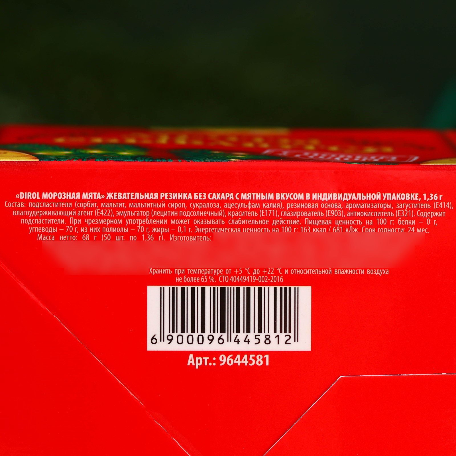 Запрет реализации по сегментам: 00000000266, 00000000593 Размер упаковки: 5.5 x 0.7 x 2.5 см. Темпер. ограничение НЕ ВЫШЕ ℃: +25 Темпер. ограничение НЕ ВЫШЕ ℃: +25 tnved: 1704101000 Вес нетто, г: 68 Символ года: Нет Набор: Да Новогодняя коллекция: Новый год Индивидуальная упаковка: Да С жидким центром: Нет Вкус: Мята Форма: Подушечка Тематика праздника: Новый год ПРИ ОФОРМЛЕНИИ ЗАКАЗА, ПРОСИМ ЗАПРАШИВАТЬ АКТУАЛЬНЫЕ СРОКИ ГОДНОСТИ У МЕНЕДЖЕРА Состав: подсластители( сорбит, мальтит, мальтитный сироп, сукралоза, ацесульфам калия), резиновая основа, ароматизаторы, загуститель (Е141), влагоудерживающий агент (Е422), эмульгатор (лецитин подсолнечный), краситель (Е171), глазирователь (Е903), антиокислитель (Е321). Срок годности: 24 месяца Масса нетто: 68 г (50 шт. x 1,36 г). | ||