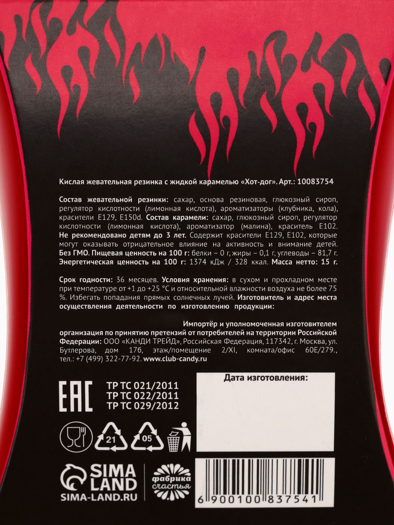 Запрет реализации по сегментам: 00000000266, 00000000593 Вкус: Кола, Тутти-фрутти Размер упаковки: 8 x 2 x 13 см. Вес нетто, г: 12 С жидким центром: Да Темпер. ограничение НЕ ВЫШЕ ℃: +18 Форма: Фигурные Срок годности, мес: 36 Индивидуальная упаковка: Да Тематика праздника: Универсальная тематика Тематика праздника: Универсальная тематика tnved: 1704101000 При оформление заказа, просим запрашивать актуальные сроки годности у менеджераСостав: сахар, основна резиновая, глюкозный сироп, регулятор кислотности (лимонная кислота), агент влагоудерживающий (глицерин), ароматизаторы (тутти-фрутти, кола,), красители Е102, Е110, Е129, Е155. Срок годности: 36 месяцев Масса нетто: 12 гр | ||