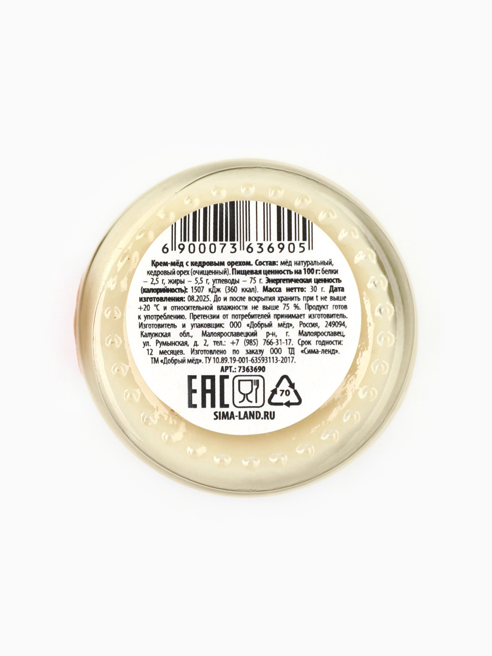 Вид: Крем-мёд, Медовый мусс Размер упаковки: 3.5 x 4.5 x 4.5 см. Тематика: Новогодняя tnved: 1702909400 Запрет реализации по сегментам: 00000000266 Тематика праздника: Новый год Вкус: Кедровые орехи Новогодняя коллекция: Новый год Набор: Нет Символ года: Символ года 2026 (Лошадь) Температурное ограничение: Нет Добавки: Кедровый орех Вес нетто, г: 30 ПРИ ОФОРМЛЕНИИ ЗАКАЗА, ПРОСИМ ЗАПРАШИВАТЬ АКТУАЛЬНЫЕ СРОКИ ГОДНОСТИ У МЕНЕДЖЕРА Крем-мёд с кедровым орехом. Состав: мёд натуральный, кедровый орех (очищенный). Пищевая ценность на 100 г: белки – 2,5 г, жиры – 5,5 г, углеводы – 75 гр Энергетическая ценность (калорийность): 1507 кДж (360 ккал). | ||
