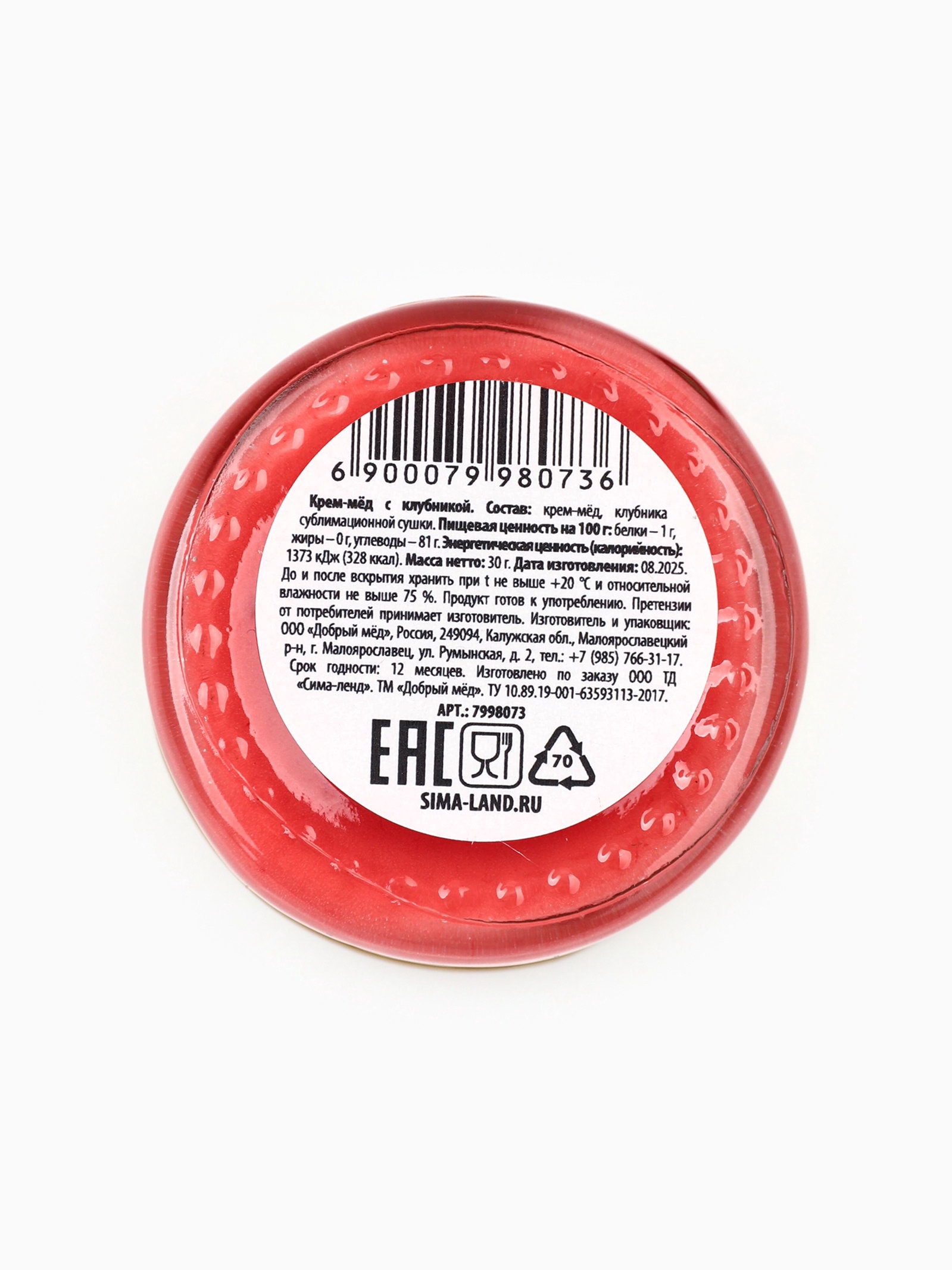 Вид: Крем-мёд, Медовый мусс Размер упаковки: 4 x 3 x 4 см. Тематика: Новогодняя tnved: 1702909400 Запрет реализации по сегментам: 00000000266 Тематика праздника: Новый год Вкус: Клубника Новогодняя коллекция: Новый год Набор: Нет Символ года: Символ года 2026 (Лошадь) Температурное ограничение: Нет Вес нетто, г: 30 Добавки: Клубника ПРИ ОФОРМЛЕНИИ ЗАКАЗА, ПРОСИМ ЗАПРАШИВАТЬ АКТУАЛЬНЫЕ СРОКИ ГОДНОСТИ У МЕНЕДЖЕРА Крем-мёд с апельсином. Состав: крем-мёд, клубника сублимационной сушки. Пищевая ценность на 100 гр : белки - 1 гр, жиры - 0 гр, углеводы - 78 гр Энергетическая ценность (калорийность): 1323 кДж (316 ккал). Масса нетто: 30 гр Срок годности: 12 месяцев | ||
