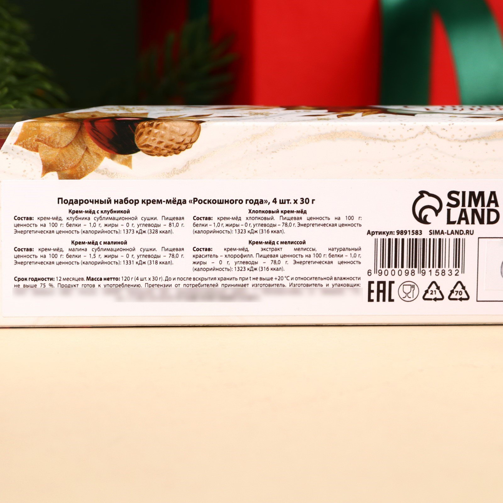 Запрет реализации по сегментам: 00000000266, 00000000593 Добавки: Клубника, Малина, Мелисса, Хлопковый Размер упаковки: 5 x 4 x 18.5 см. tnved: 409000000 tnved: 409000000 Символ года: Нет Новогодняя коллекция: Новый год Набор: Да Вес нетто, г: 120 Вид: Крем-мёд Тематика праздника: Новый год ПРИ ОФОРМЛЕНИИ ЗАКАЗА, ПРОСИМ ЗАПРАШИВАТЬ АКТУАЛЬНЫЕ СРОКИ ГОДНОСТИ У МЕНЕДЖЕРА Крем-мёд с клубникой Состав: крем-мёд, клубника сублимационной сушки. Крем-мёд с малиной Состав: крем-мёд, малина сублимационной сушки. Хлопковый крем-мёд Состав: крем-мёд хлопковый. Крем-мёд с мелиссой Состав: крем-мёд, экстракт мелиссы, натуральный краситель - хлорофилл. Срок годности: 12 месяцев Масса нетто: 120 г (4 шт. x 30 г). | ||