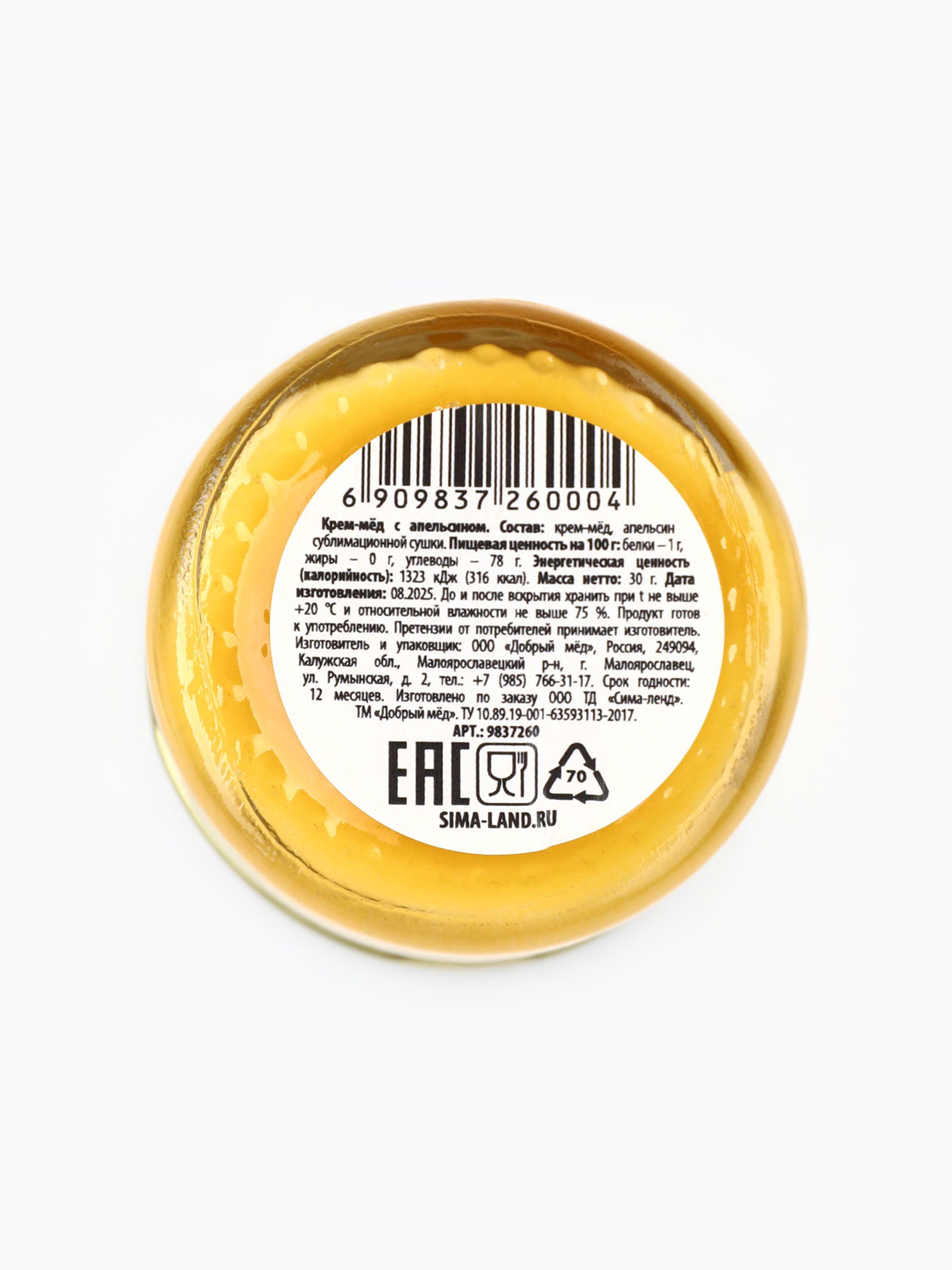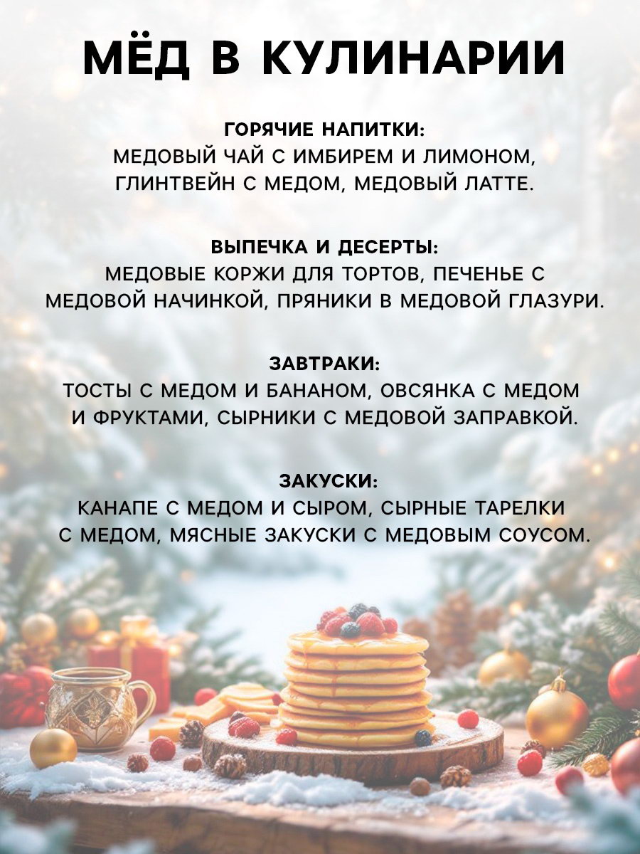 Вид: Крем-мёд, Медовый мусс Размер упаковки: 4 x 4 x 3 см. Символ года: Нет Тематика: Новогодняя tnved: 1702909400 tnved: 1702909400 Запрет реализации по сегментам: 00000000266 Тематика праздника: Новый год Добавки: Апельсин Новогодняя коллекция: Новый год Вкус: Апельсин Набор: Нет Температурное ограничение: Нет Вес нетто, г: 30 ПРИ ОФОРМЛЕНИИ ЗАКАЗА, ПРОСИМ ЗАПРАШИВАТЬ АКТУАЛЬНЫЕ СРОКИ ГОДНОСТИ У МЕНЕДЖЕРА Крем-мёд с апельсином. Состав: крем-мёд, апельсин сублимационной сушки. Пищевая ценность на 100 гр : белки - 1 гр, жиры - 0 гр, углеводы - 78 гр Энергетическая ценность (калорийность): 1323 кДж (316 ккал). Масса нетто: 30 гр Срок годности: 12 месяцев | ||