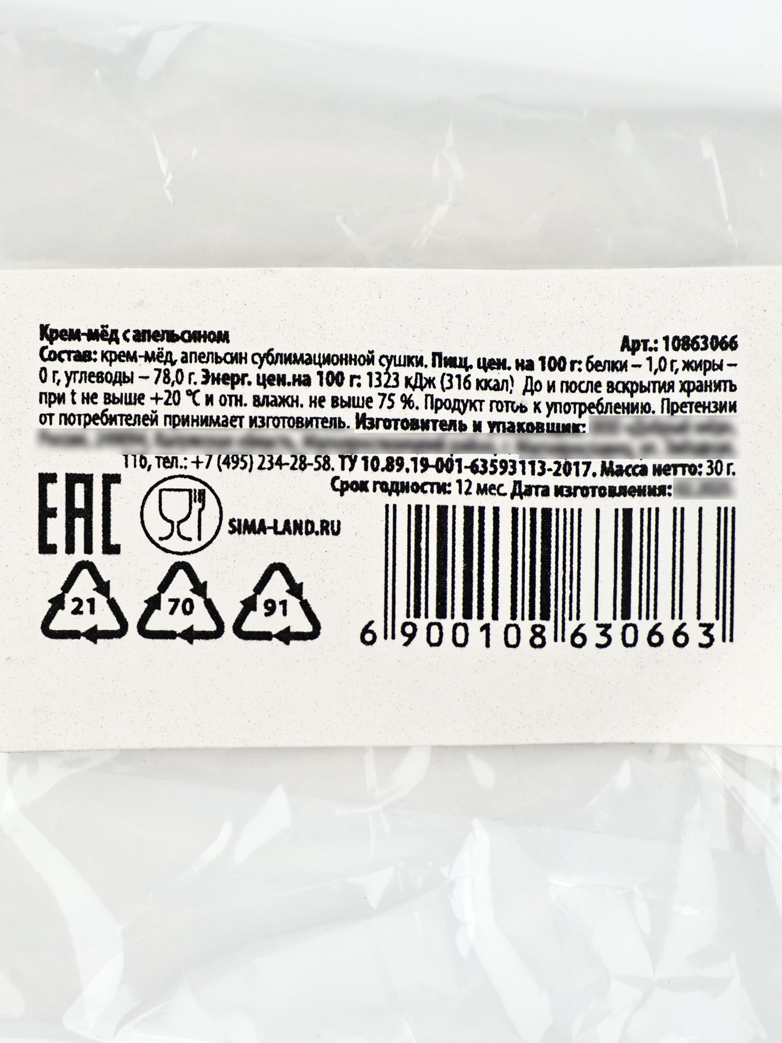 Размер упаковки: 4 x 3.5 x 4 см. Запрет реализации по сегментам: 00000000266 Вид: Крем-мёд Вес нетто, г: 30 Добавки: Апельсин Тематика праздника: 23 Февраля Срок годности, мес: 12 Срок годности, мес: 12 tnved: 1702909400 ПРИ ОФОРМЛЕНИИ ЗАКАЗА, ПРОСИМ ЗАПРАШИВАТЬ АКТУАЛЬНЫЕ СРОКИ ГОДНОСТИ У МЕНЕДЖЕРА Состав: крем-мёд, апельсин сублимационной сушки. Масса нетто: 30 гр Срок годности: 12 месяцев. | ||