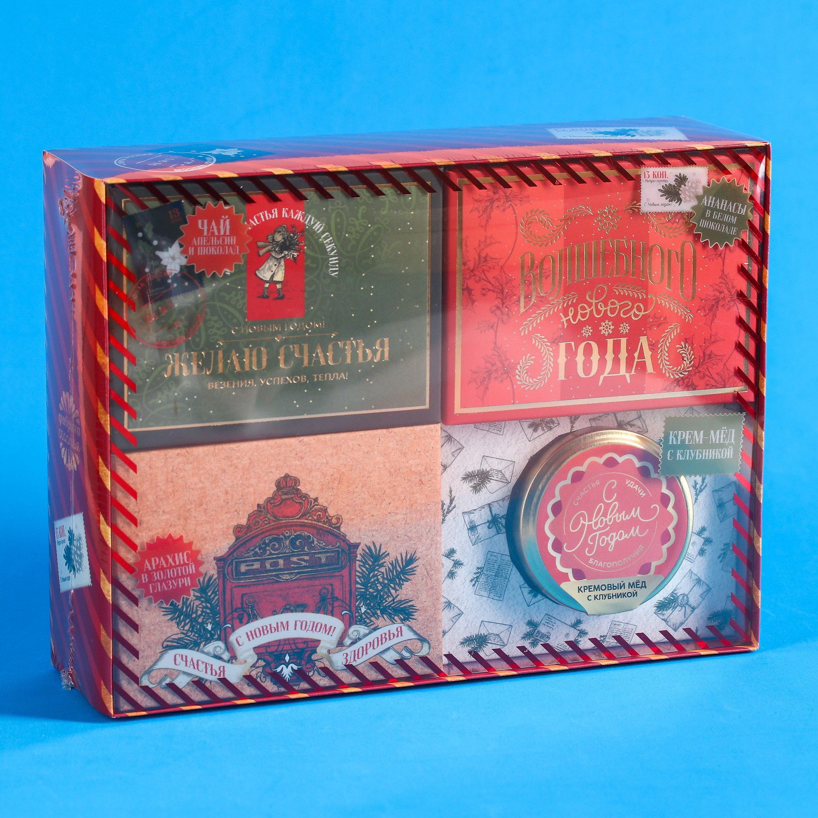 Подарочный набор новогодний "Счастливого нового года", чай чёрный 50 г, арахис 100 г, ананас 100 г, крем-мёд 120 г, Фабрика счастья, Россия