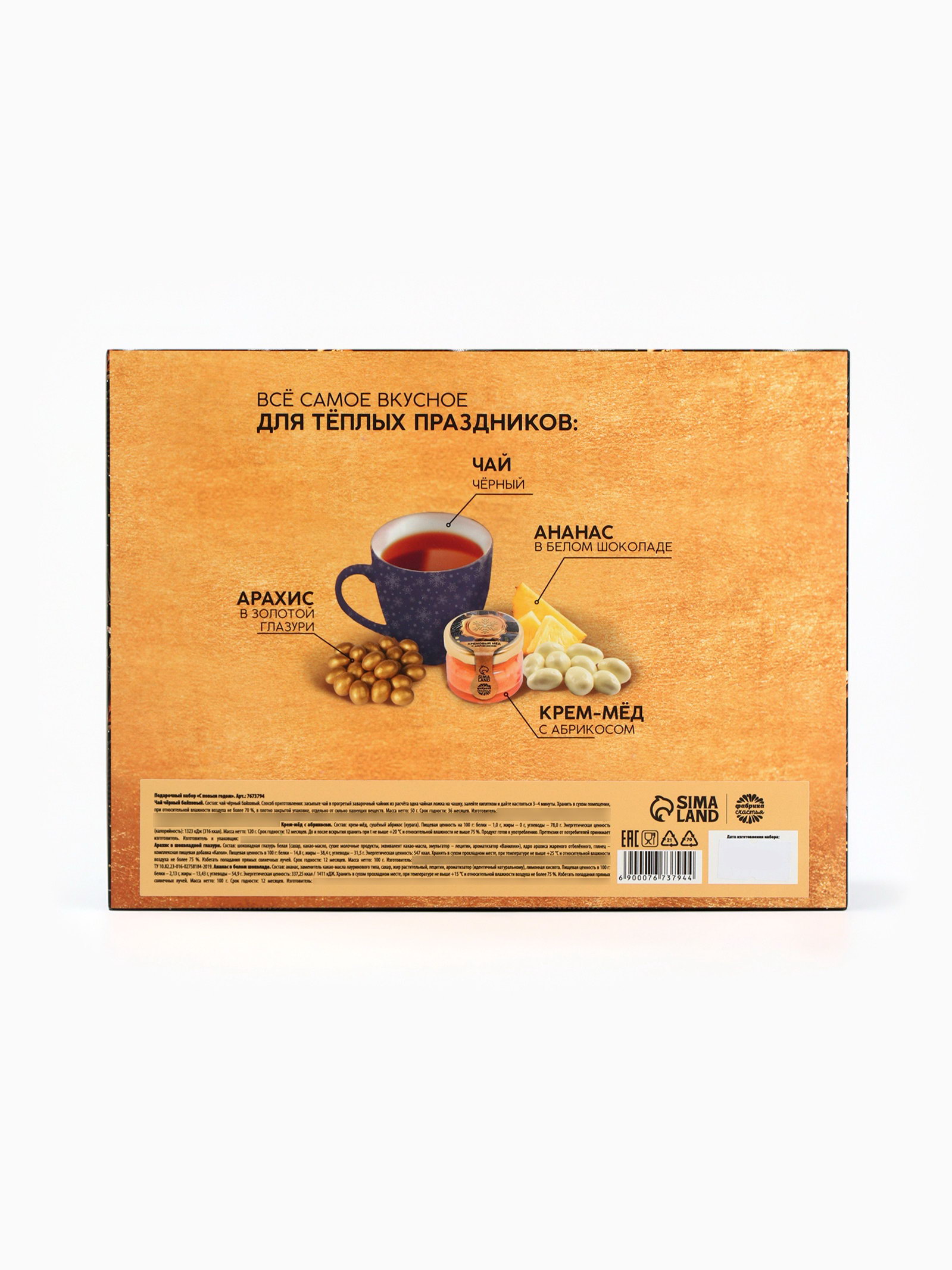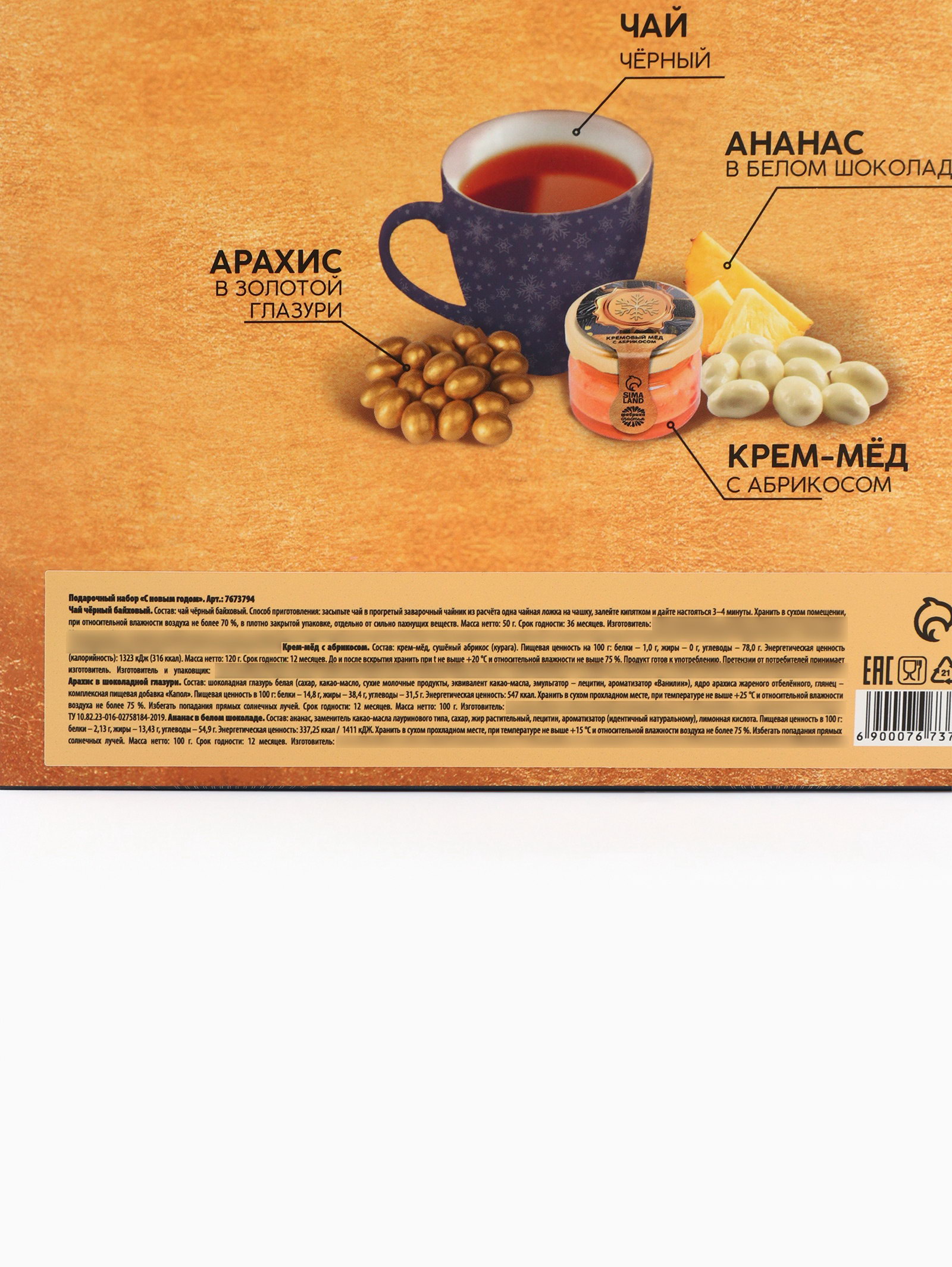 Вес нетто, г: 50, 100, 120 Запрет реализации по сегментам: 00000000266, 00000000593 Составляющие набора: Арахис, Крем-мёд, Чай Для кого: Для женщины, Для мужчины, Унисекс Размер упаковки: 22.5 x 17 x 6.5 см. Вид чая: Чёрный Фасовка: Весовой tnved: 902300000 Набор: Да Температурное ограничение: Нет Тематика праздника: Новый год Символ года: Нет В наборе, шт.: 2 Возраст: Для взрослых Адресат: Без адресата Вид упаковки: Подарочная коробка Тематика подарка: Продукты питания Новогодняя коллекция: Новогодняя коллекция: Золотой шик Кремовый мёд с абрикосом, 120 гр Состав: крем-мед, сушёный абрикос (курага). Срок годности: 12 месяцев Масса нетто: 120 гр Арахис в шоколадной глазури, 100 гр Состав: шоколадная глазурь белая (сахар, какао-масло, сухие молочные продукты, эквивалент какао-масла, эмульгатор - лецитин, ароматизатор "Ванилин"), ядро арахиса жареного отбеленного, глянец - комплексная пищевая добавка "Капол" Срок годности: 12 месяцев Масса нетто: 100 гр Ананас в белом шоколаде, 100 гр Состав: ананс, заменитель како-масла лауринового типа, сахар, жир растительный, лецитин, ароматизатор (идентичный натуральному), лимонная кислота Масса нетто: 100 гр Срок годности: 12 месяцев Чай чёрный Состав: чай чёрный байховый Срок годности: 36 месяцев | ||