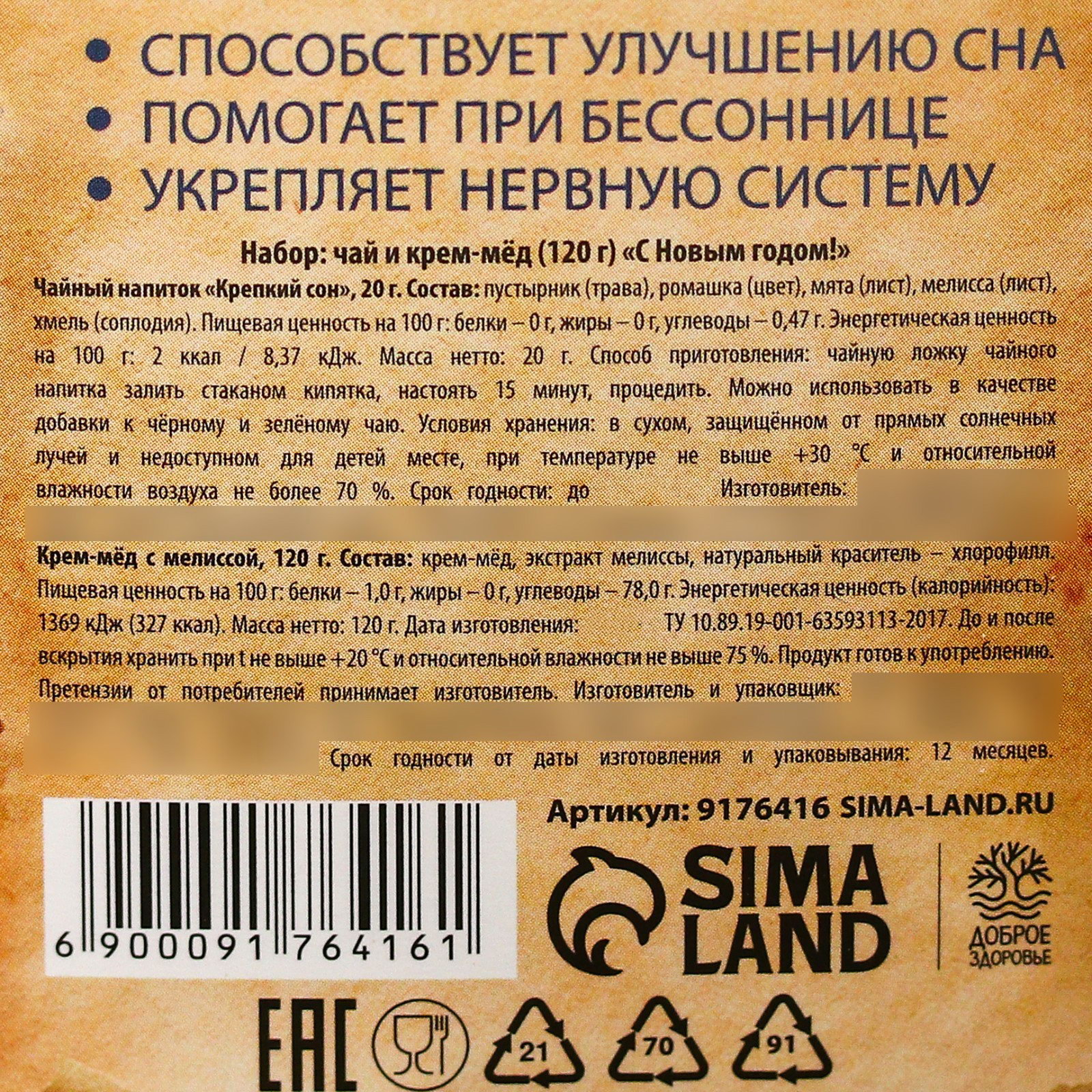 Вкус: Мелисса, Мята, Ромашка Запрет реализации по сегментам: 00000000266, 00000000593 Составляющие набора: Крем-мёд, Чай Размер упаковки: 6.5 x 19 x 7 см. В наборе, шт.: 2 Вес нетто, г: 120 Вид упаковки: Подарочная коробка Возраст: Для взрослых Для кого: Унисекс Тематика подарка: Продукты питания Адресат: Без адресата Символ года: Нет Символ года: Нет tnved: 409000000 Набор: Да Новогодняя коллекция: Новый год Температурное ограничение: Нет Тематика праздника: Новый год Чайный напиток "Крепкий сон", 20 г Состав: пустырник (трава), ромашка (цвет), мята (лист), мелисса (лист), хмель соплодия. Масса нетто: 20 г Способ приготовления: чайную ложку чайного напитка залить стаканом кипятка, настоять 15 минут, процедить. Можно использовать в качестве добавки к чёрному и зелёному чаю. Крем-мёд с мелиссой, 120 г Состав: крем-мёд, экстракт мелиссы, натуральный краситель – хлорофилл. Масса нетто: 120 гр Срок годности от даты изготовления и упаковывания: 12 месяцев | ||