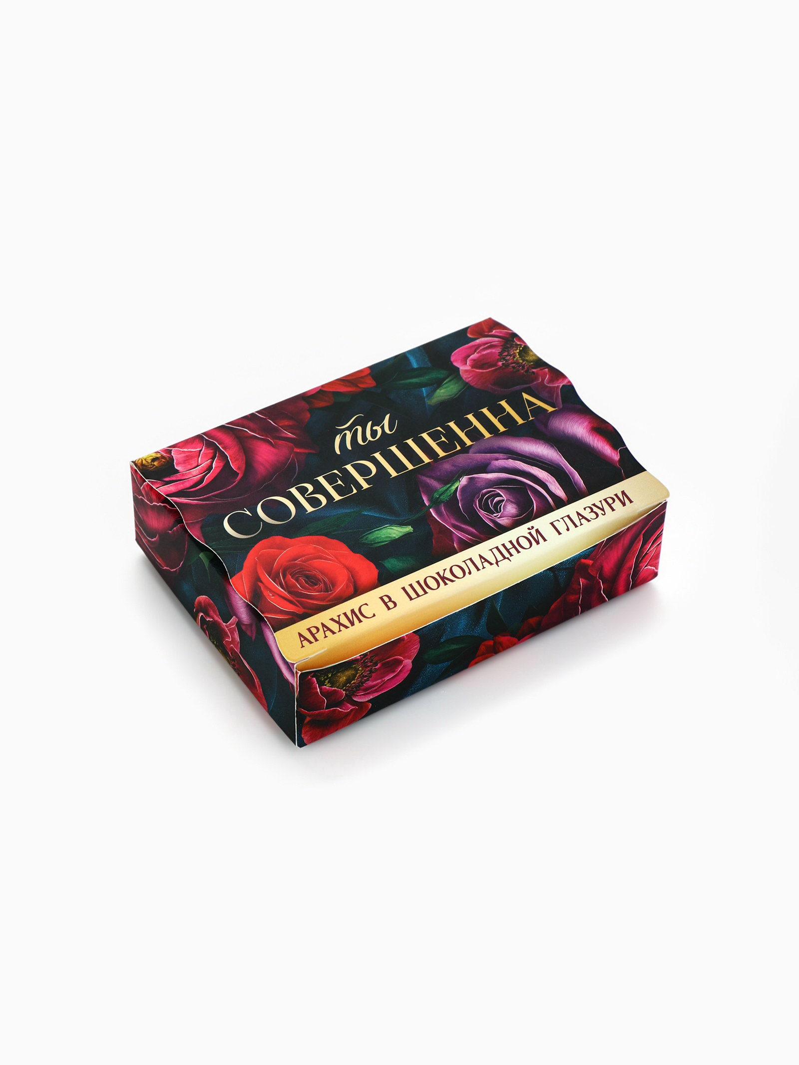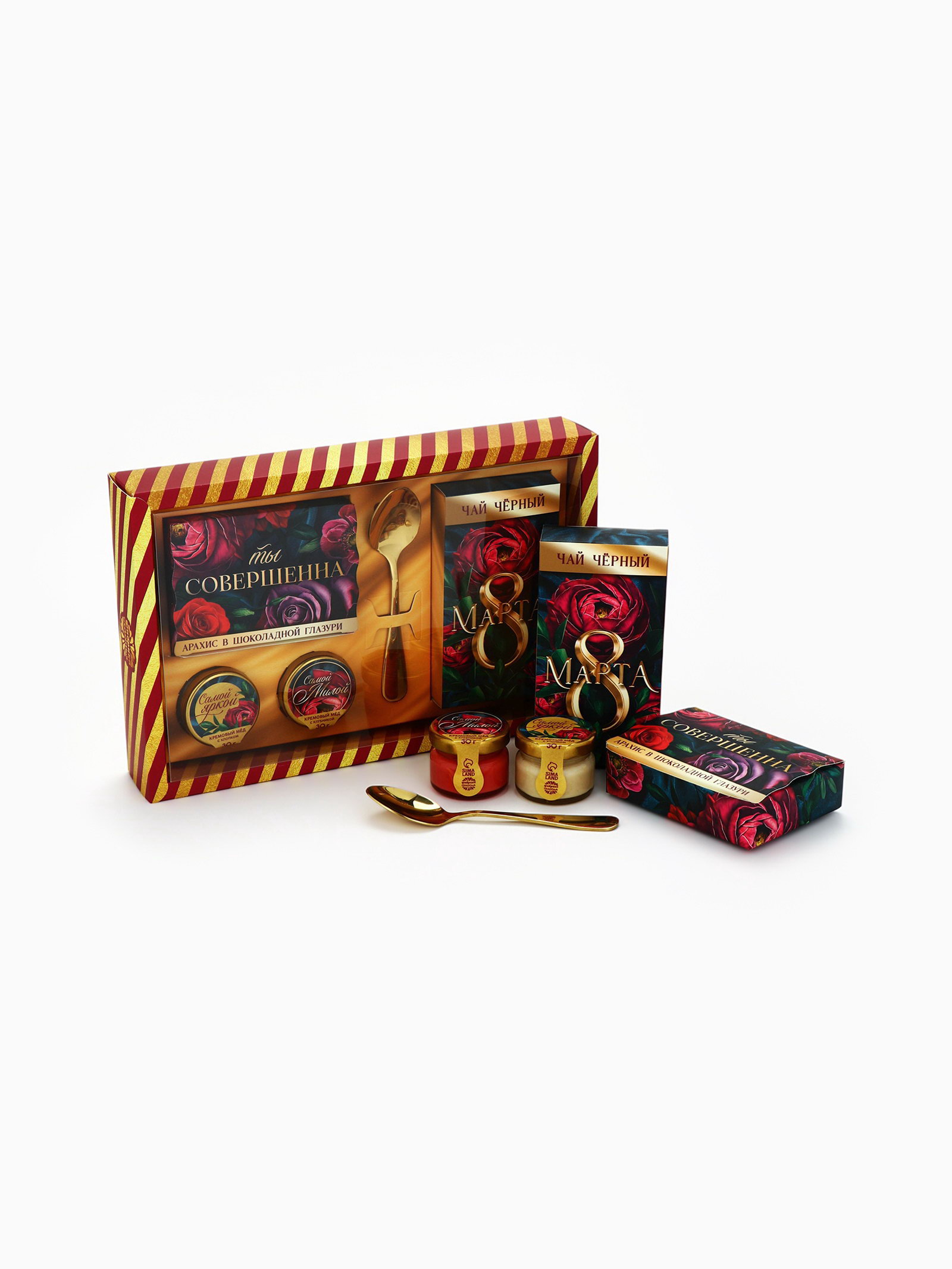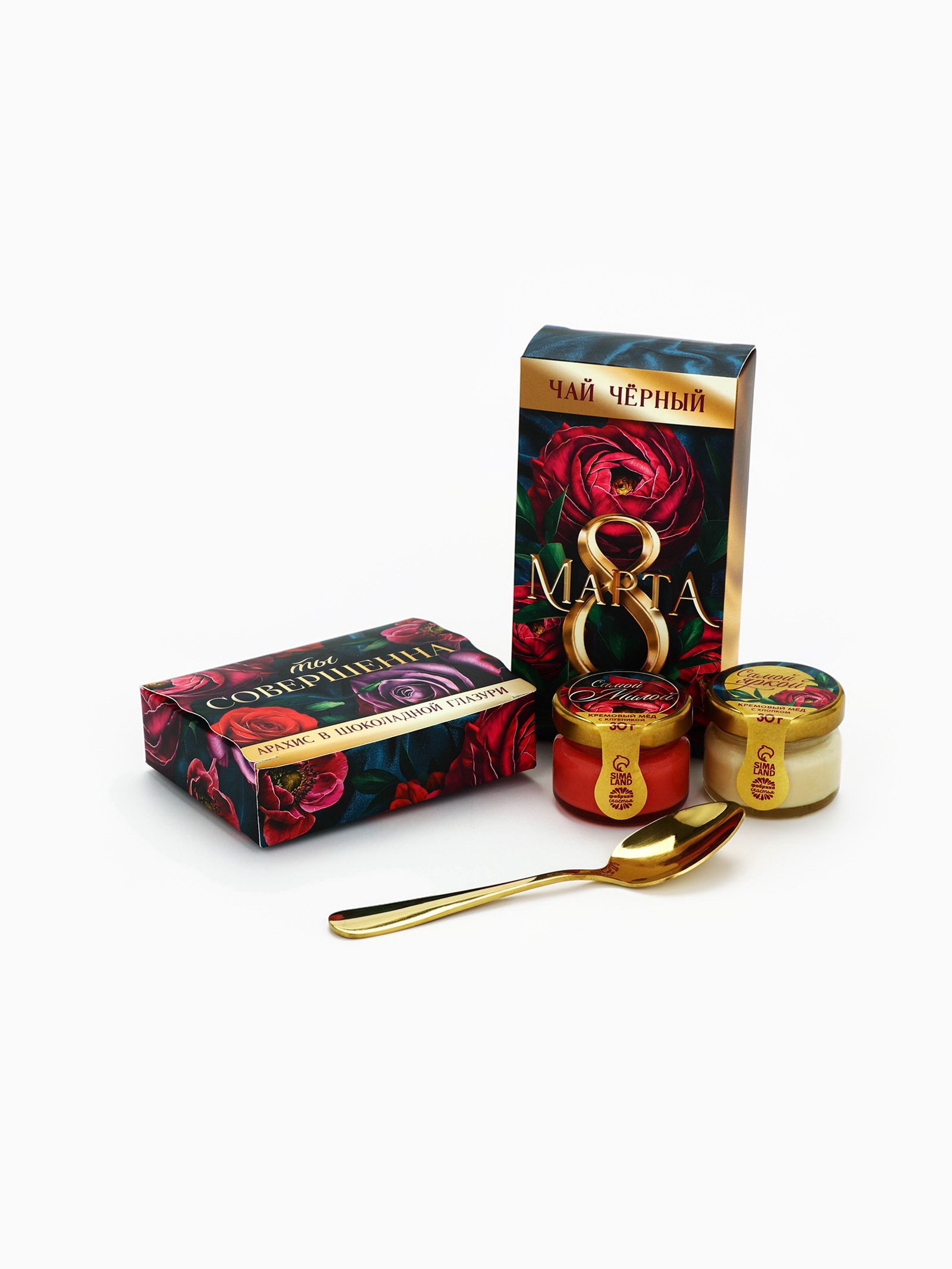 Подарочный набор "Ты совершенна": крем-мёд с клубникой и хлопком 30 г x 2 шт., арахис в шоколадной глазури 70 г, чай чёрный с тропическими фруктами 50 г, ложка, Фабрика счастья, Россия