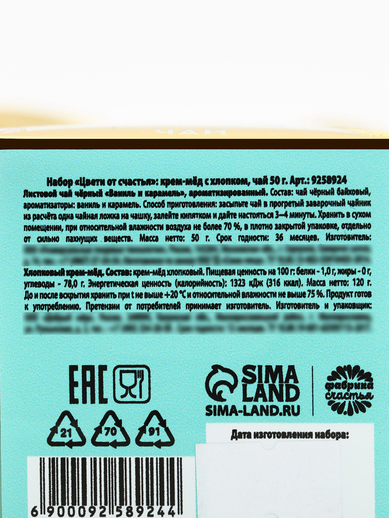 Вес нетто, г: 50, 120 Вкус: Апельсин, Шоколад Запрет реализации по сегментам: 00000000266, 00000000593 Составляющие набора: Крем-мёд, Чай Тематика праздника: 8 Марта, Универсальная тематика Возраст: Взрослый, Для взрослых, Подростковый Размер упаковки: 7.5 x 18 x 7.5 см. tnved: 902300000 Адресат: Без адресата Белки, г: 1 Набор: Да Энергетическая ценность, ккал: 316 Углеводы, г: 78 Температурное ограничение: Нет Тематика подарка: Продукты питания Вид упаковки: Подарочная коробка Для кого: Для женщины В наборе, шт.: 2 Темпер. ограничение НЕ ВЫШЕ ℃: +18 Чай черный байховый "Апельсин и шоколад" – ароматизированный Состав: чай чёрный байховый, ароматизаторы: шоколад, апельсин. Масса нетто: 50 гр Срок годности: 36 месяцев. Крем-мёд хлопковый Состав: крем-мёд хлопковый. Масса нетто: 120 гр Срок годности и условия хранения: 12 месяцев с даты изготовления при температуре хранения не выше +20 ℃ и относительной влажности не выше 75 %. Продукт готов к употреблению. Претензии от потребителей принимает изготовитель. | ||