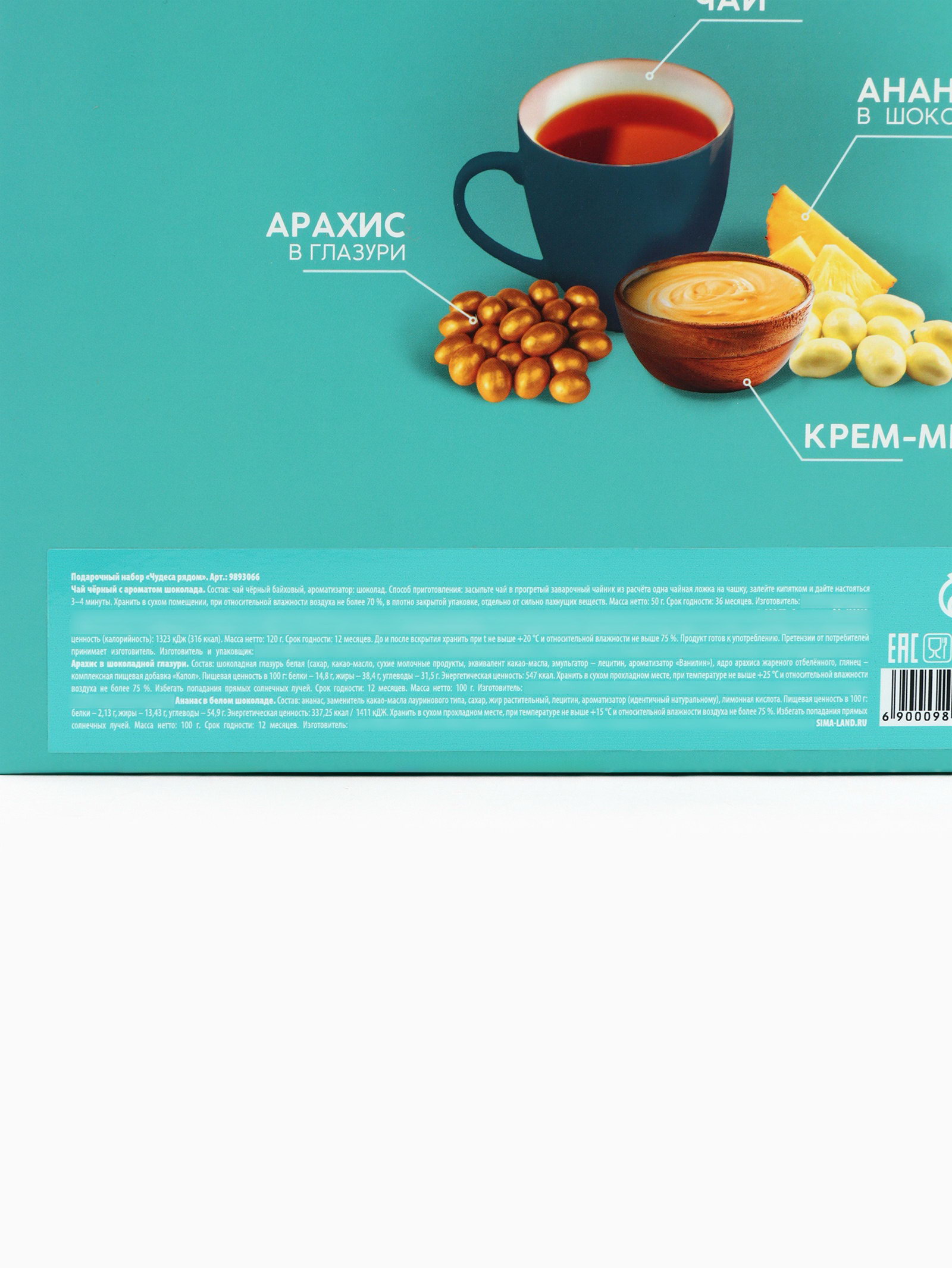 Запрет реализации по сегментам: 00000000266, 00000000593 Составляющие набора: Арахис, Крем-мёд, Чай Размер упаковки: 17 x 6.5 x 22 см. Вид чая: Чёрный Символ года: Нет Новогодняя коллекция: Новый год tnved: 902300000 Фасовка: Весовой Набор: Да Адресат: Без адресата Для кого: Унисекс Тематика праздника: Новый год Вид упаковки: Подарочная коробка Тематика подарка: Продукты питания Возраст: Для взрослых В наборе, шт.: 4 ПРИ ОФОРМЛЕНИИ ЗАКАЗА, ПРОСИМ ЗАПРАШИВАТЬ АКТУАЛЬНЫЕ СРОКИ ГОДНОСТИ У МЕНЕДЖЕРА Чай чёрный со вкусом шоколада Состав: чай чёрный байховый, ароматизатор: шоколад. Способ приготовления: засыпьте чай в прогретый заварочный чайник из расчета одна чайная ложка на чашку, залейте кипятком и дайте настояться 3-4 минуты. Срок годности: 36 месяцев Масса нетто: 50 гр Арахис в шоколадной глазури Состав: шоколадная глазурь белая (сахар, какао-масло, сухие молочные продукты, эквивалент какао-масла, эмульгатор - лецитин, ароматизатор "Ванилин"), ядро арахиса жареного отбелённого, глянец - комплексная пищевая добавка "Капол". Срок годности: 12 месяцев Масса нетто: 100 гр Хлопковый крем мёд Состав: крем-мёд хлопковый. Срок годности: 12 месяцев Масса нетто: 120 гр Ананас в шоколаде Состав: ананас, заменитель какао-масла лауринового типа, сахар, жир растительный, лецитин, ароматизатор (идентичный натуральному), лимонная кислота. Срок годности: 12 месяцев Масса нетто: 100 гр | ||